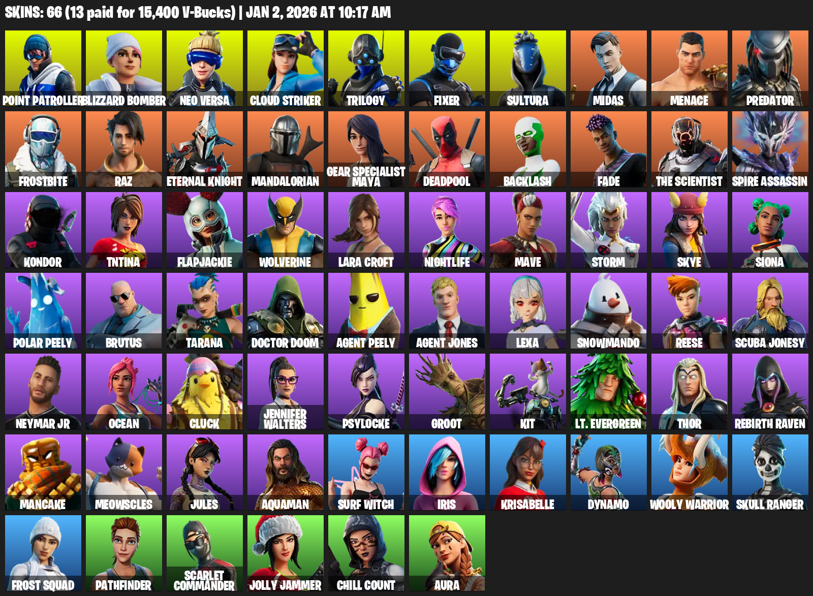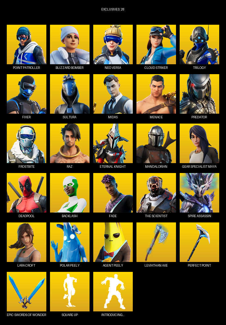 Point Patroller, Gear Specialist Maya, Lara Croft, Blizzard Bomber, Neo Versa, Cloud Striker, Trilogy, Fixer, Sultura, Midas, Menace, Predator, Frostbite, Raz, Eternal Knight, Mandalorian, Deadpool, Backlash, Fade, The Scientist