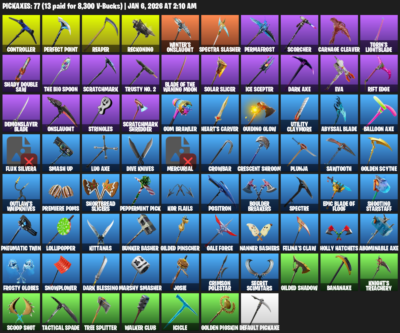 Controller, Perfect Point, Reckoning, Winter’s Onslaught, Permafrost, Scorcher, Carnage Cleaver, Torin’s Lightblade, Shady Double Saw, Scratchmark, Trusty No. 2, Solar Slicer, Ice Scepter, EVA, Rift Edge