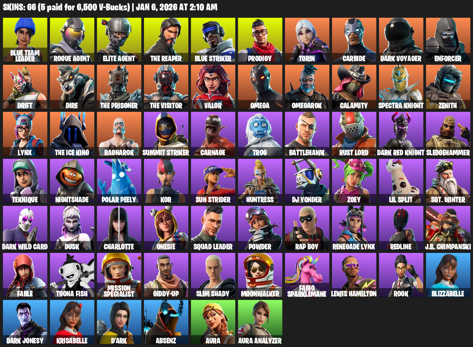 Elite Agent, The Reaper, Omega, Blue Team Leader, Prodigy, Torin, Carbide, Dark Voyager, Enforcer, Drift, Dire, Valor, Omegarok, Calamity, Spectra Knight, Zenith
