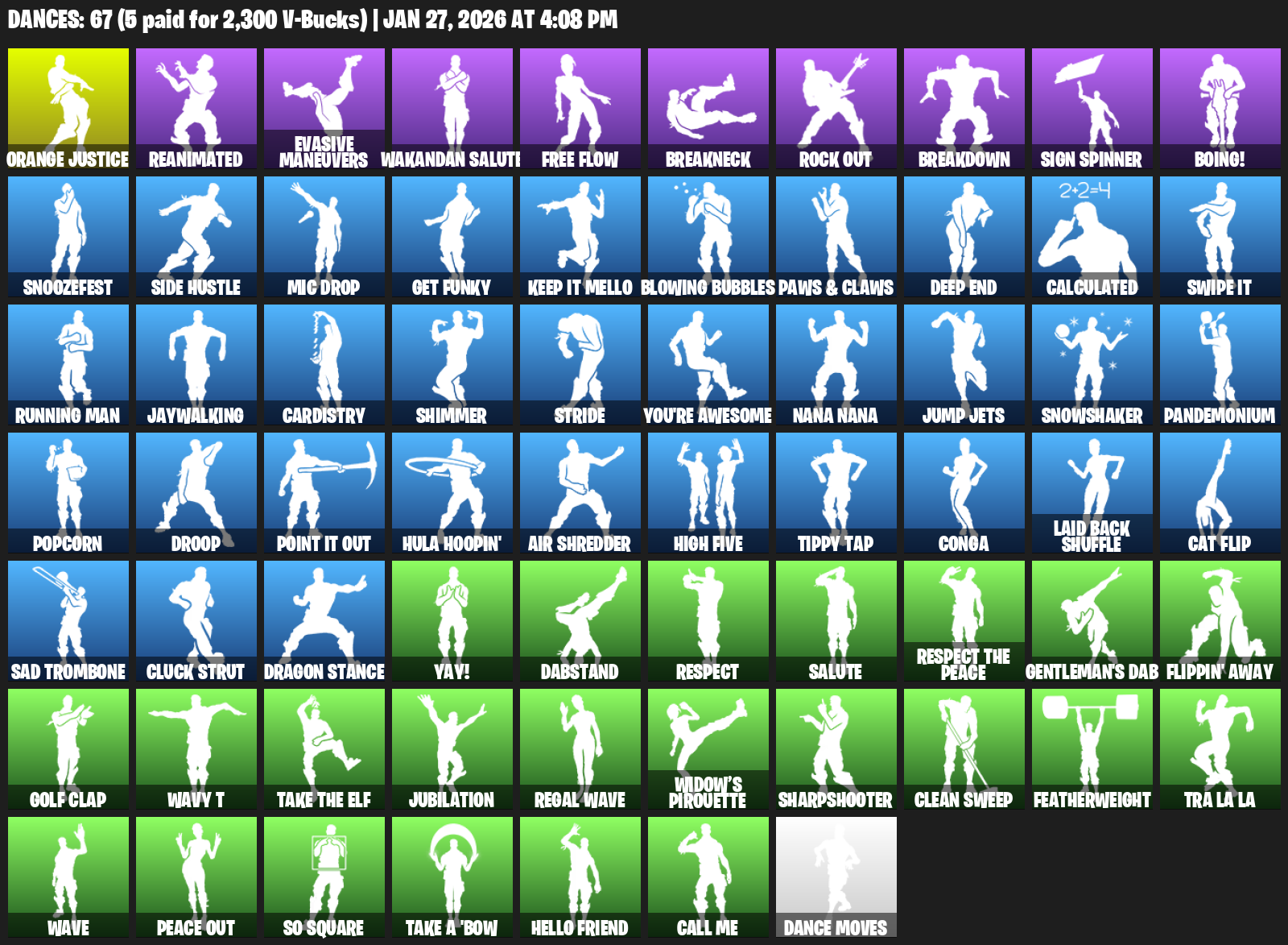 Orange Justice, Reanimated, Evasive Maneuvers, Wakandan Salute, Free Flow, Breakneck, Rock Out, Breakdown, Sign Spinner, Boing!, Snoozefest, Side Hustle, Mic Drop, Get Funky, Keep It Mello, Blowing Bubbles, Paws & Claws, Deep End, Calculated