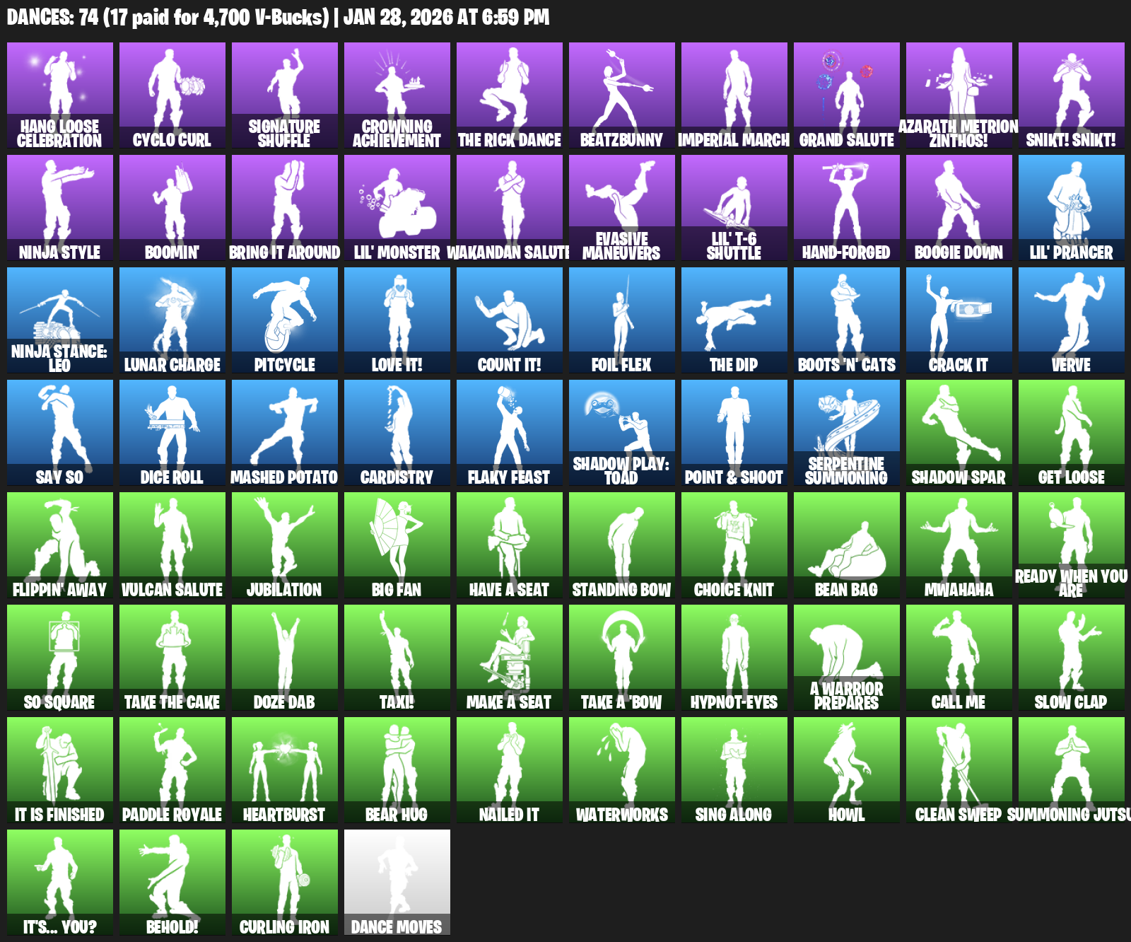 Hang Loose Celebration, Cyclo Curl, Signature Shuffle, Crowning Achievement, BeatzBunny, Imperial March, Grand Salute, Azarath Metrion Zinthos!, Snikt! Snikt!, Ninja Style, Boomin’, Bring it around, Lil’ Monster, Evasive Maneuvers, Hand-Forged, Boogie Down