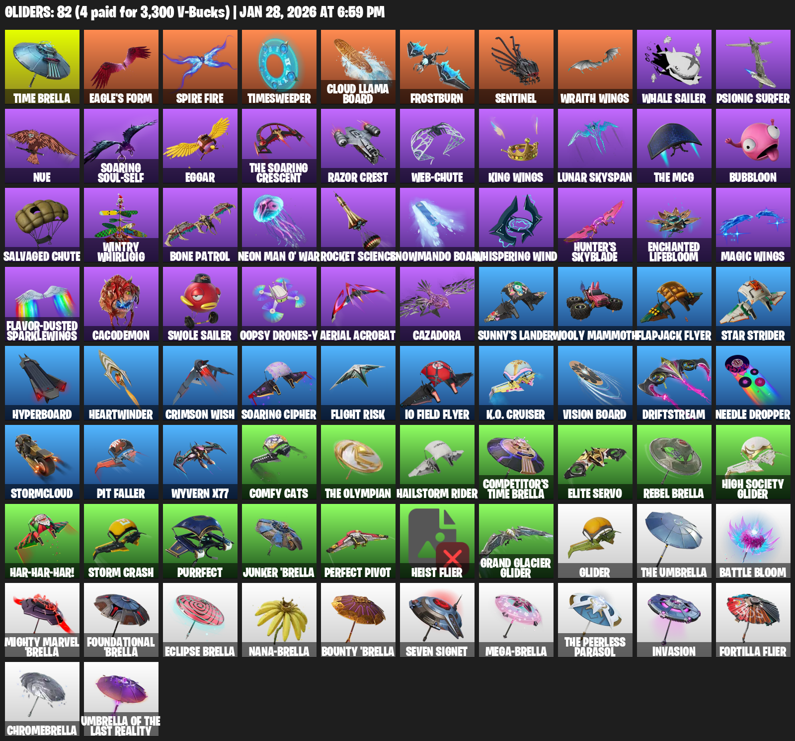 Time Brella, Eagle’s Form, Timesweeper, Cloud Llama Board, Frostburn, Sentinel, Wraith Wings, Whale Sailer, Psionic Surfer, Nue, Soaring Soul-Self, Eggar, Razor Crest, Lunar Skyspan, Bubbloon