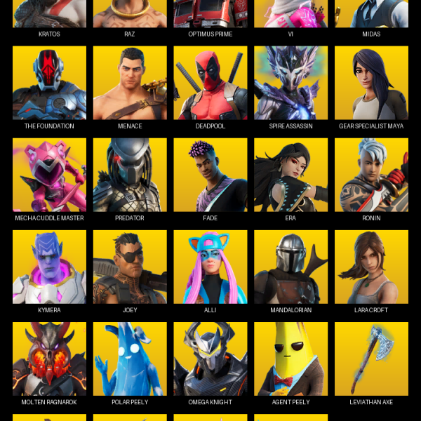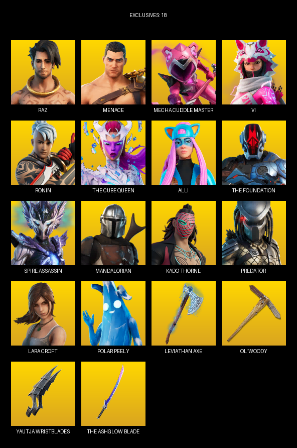 Lara Croft, Raz, Menace, Mecha Cuddle Master, Vi, Ronin, The Cube Queen, Alli, Spire Assassin, Mandalorian, Kado Thorne, Predator, Reese, Deimos, Cluck, Llambro, Mave, Mae, Khaby Lame