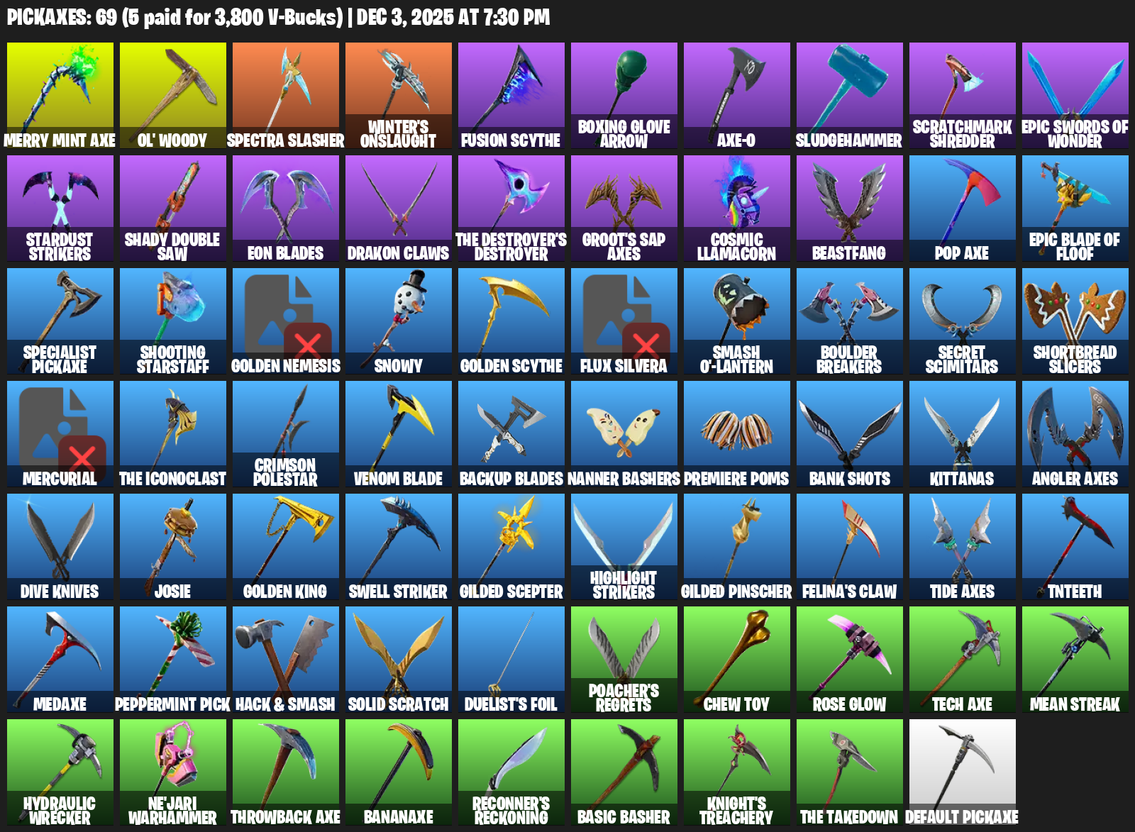 Merry Mint Axe, Ol’ Woody, Winter’s Onslaught, Boxing Glove Arrow, Sludgehammer, Scratchmark Shredder, Stardust Strikers, Shady Double Saw, Eon Blades, The Destroyer’s Destroyer, Groot’s Sap Axes, Cosmic Llamacorn, Beastfang