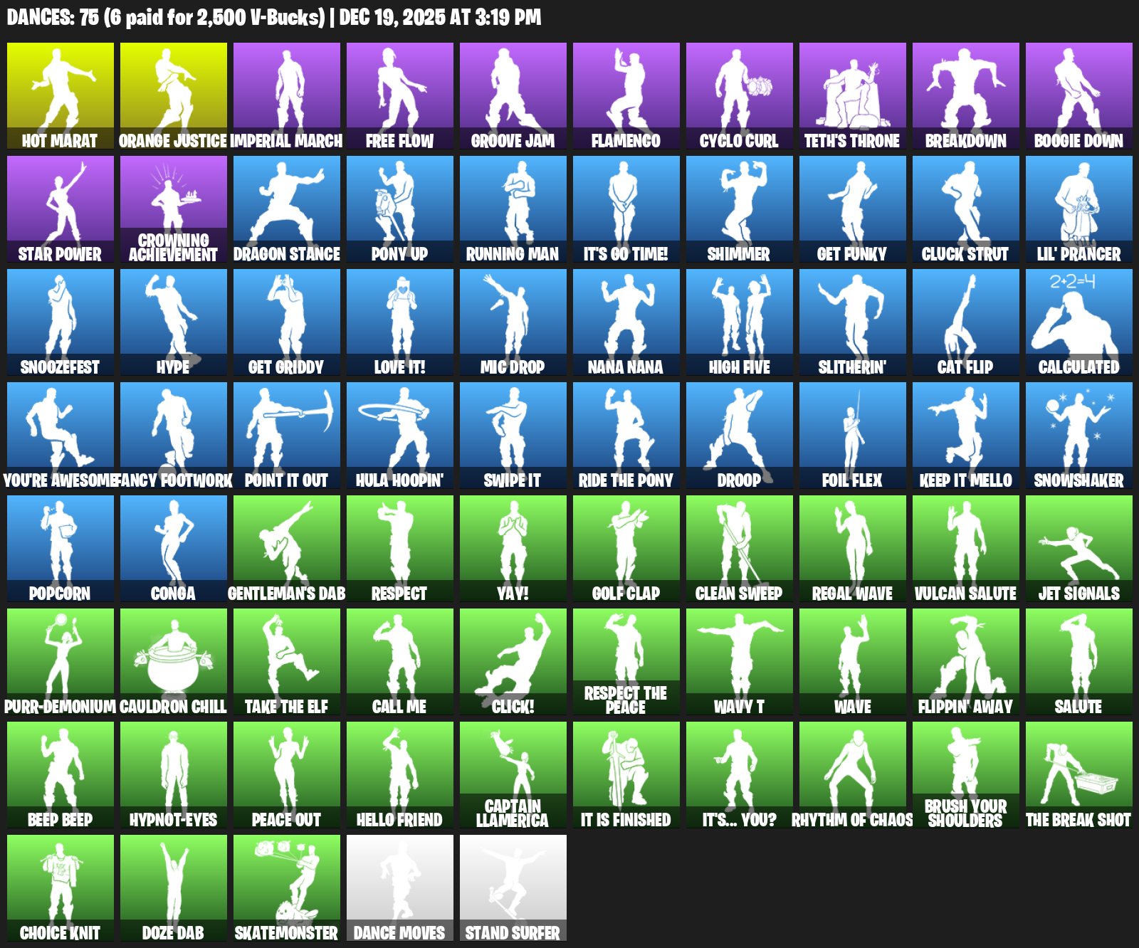 Hot Marat, Orange Justice, Imperial March, Free Flow, Groove Jam, Flamenco, Cyclo Curl, Teth’s Throne, Breakdown, Boogie Down, Star Power, Crowning Achievement, Dragon Stance, Pony Up, Running Man, It’s Go Time!, Shimmer, Get Funky, Cluck Strut, Lil’ Prancer