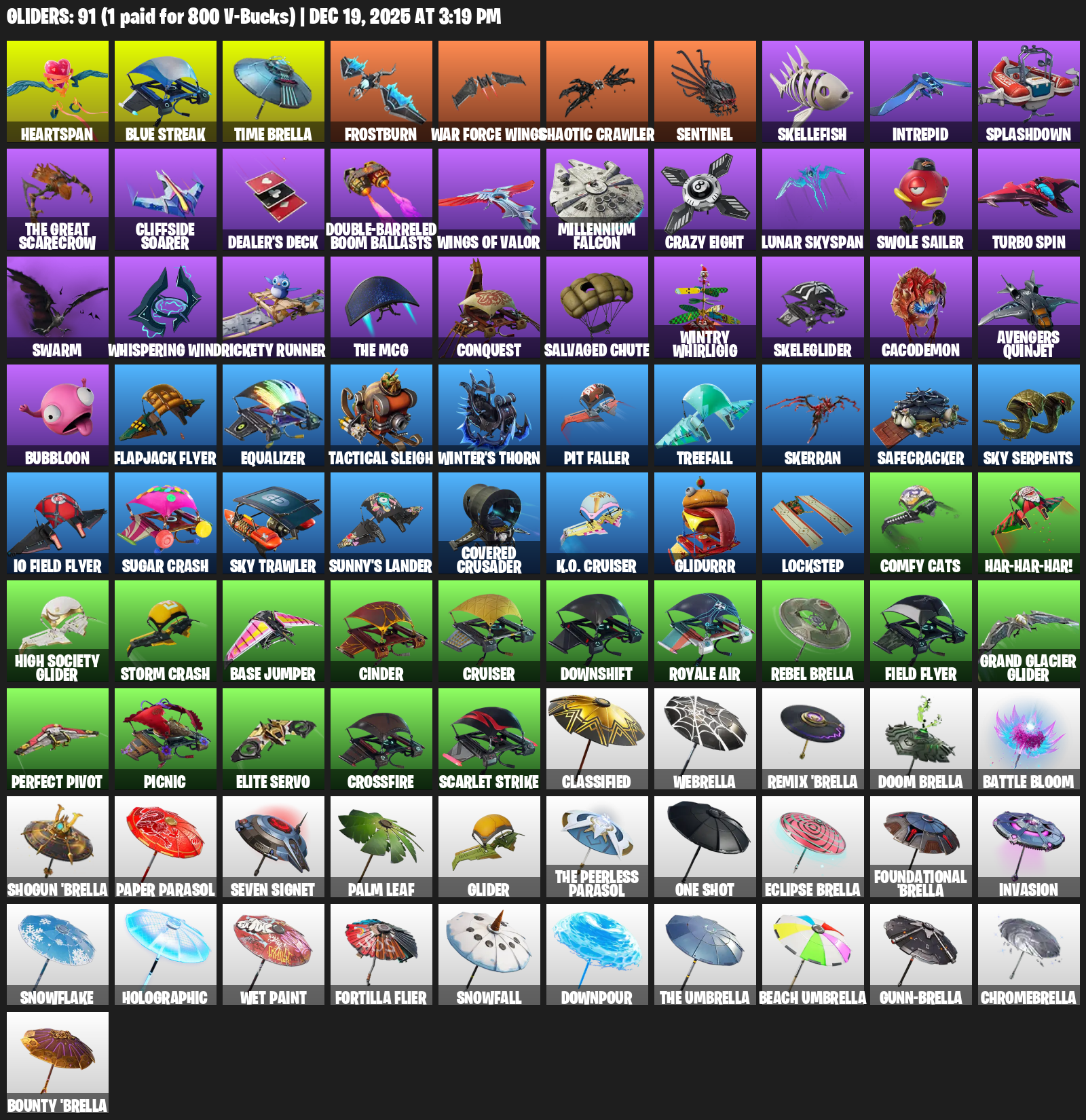 Heartspan, Time Brella, Frostburn, War Force Wings, Chaotic Crawler, Skellefish, Intrepid, Splashdown, Cliffside Soarer, Dealer’s Deck, Double-Barreled Boom Ballasts, Millennium Falcon, Crazy Eight, Lunar Skyspan, Swole Sailer, Turbo Spin