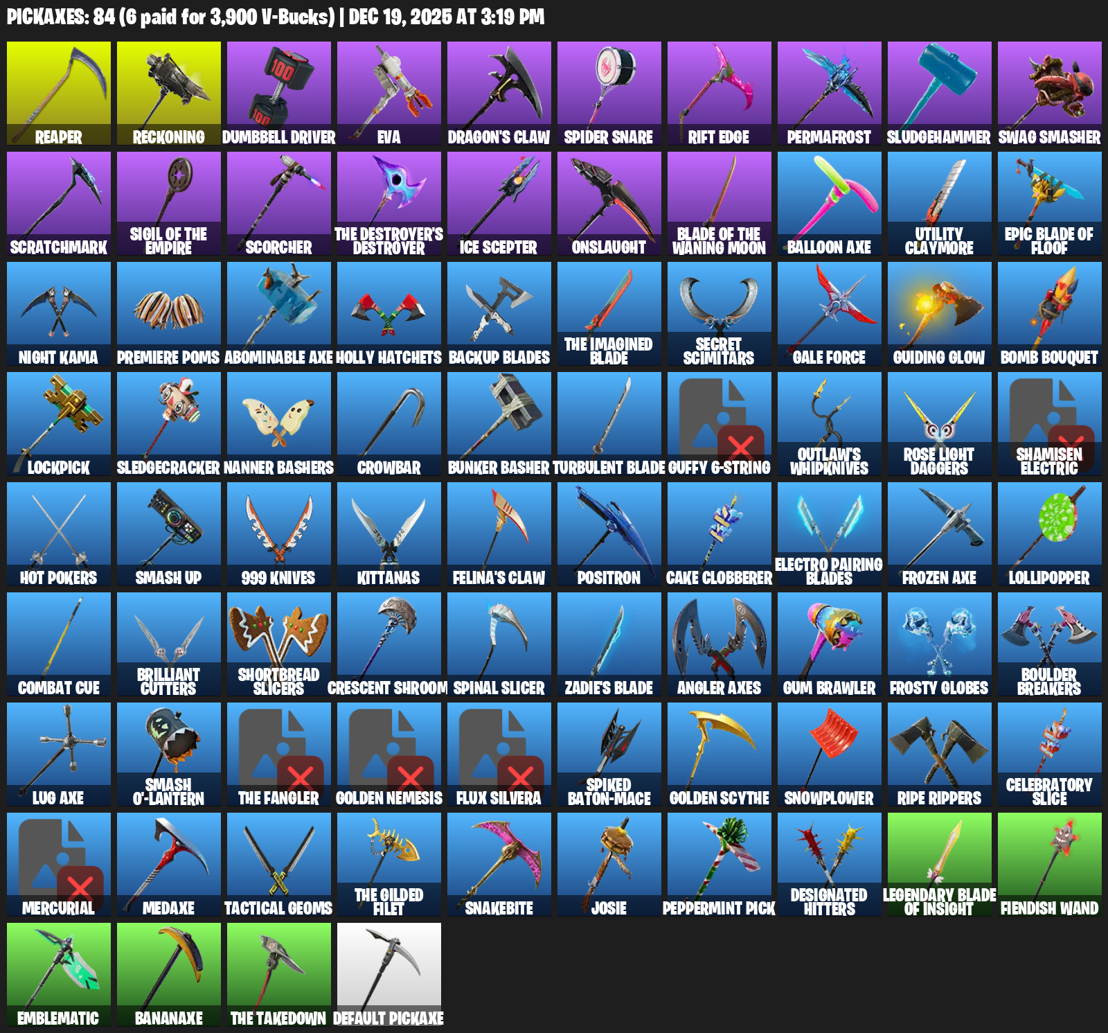 Reaper, Reckoning, Dumbbell Driver, EVA, Dragon’s Claw, Spider Snare, Rift Edge, Permafrost, Sludgehammer, Swag Smasher, Scratchmark, Scorcher, Onslaught, Balloon Axe, Utility Claymore