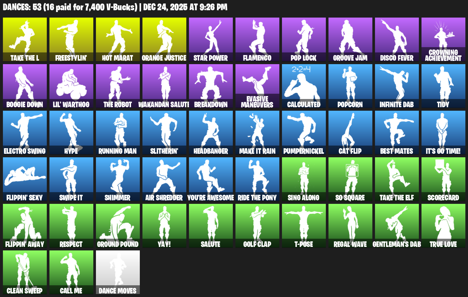 Hot Marat, Freestylin’, Orange Justice, Star Power, Flamenco, Pop Lock, Groove Jam, Disco Fever, Crowning Achievement, Boogie Down, Lil’ Warthog, Wakandan Salute, Breakdown, Evasive Maneuvers, Calculated, Popcorn, Infinite Dab, Tidy