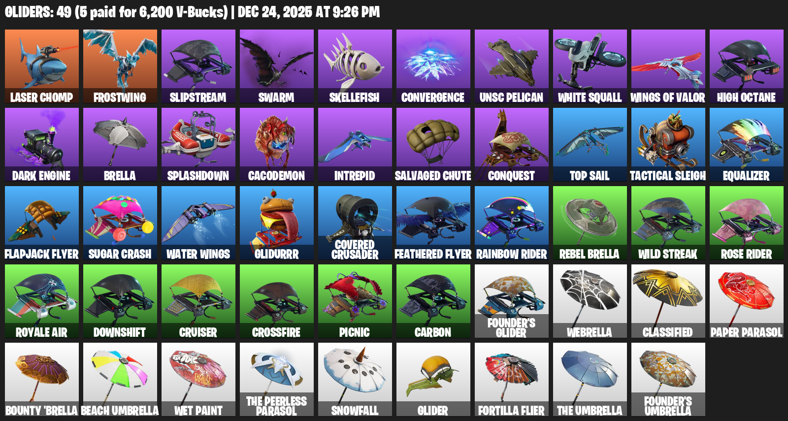 Laser Chomp, Frostwing, Slipstream, Swarm, Skellefish, Convergence, UNSC Pelican, White Squall, Wings of Valor, Brella, Splashdown, Cacodemon, Intrepid, Salvaged Chute, Conquest, Top Sail, Tactical Sleigh, Equalizer