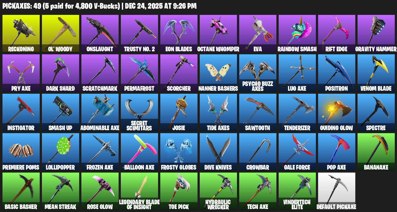 Reckoning, Ol’ Woody, Onslaught, Trusty No. 2, Eon Blades, Octane Whomper, EVA, Rainbow Smash, Rift Edge, Gravity Hammer, Pry Axe, Dark Shard, Scratchmark, Permafrost, Scorcher, Nanner Bashers, Positron, Venom Blade