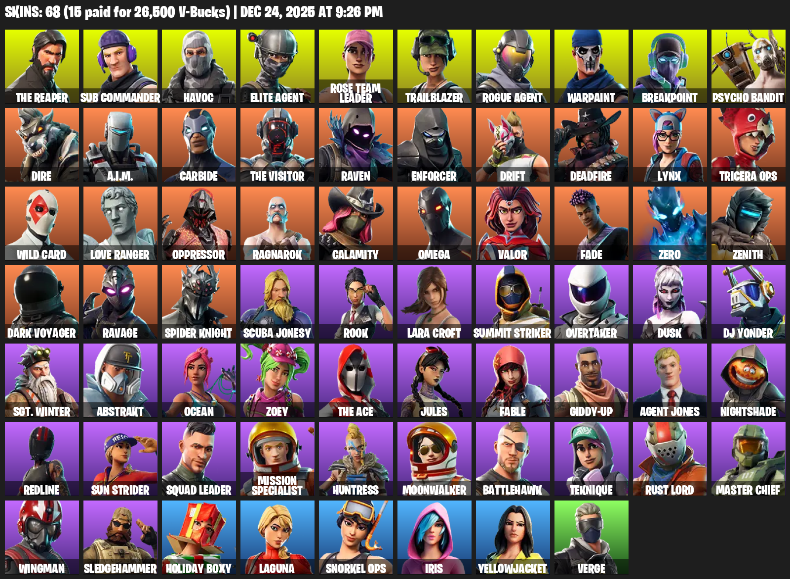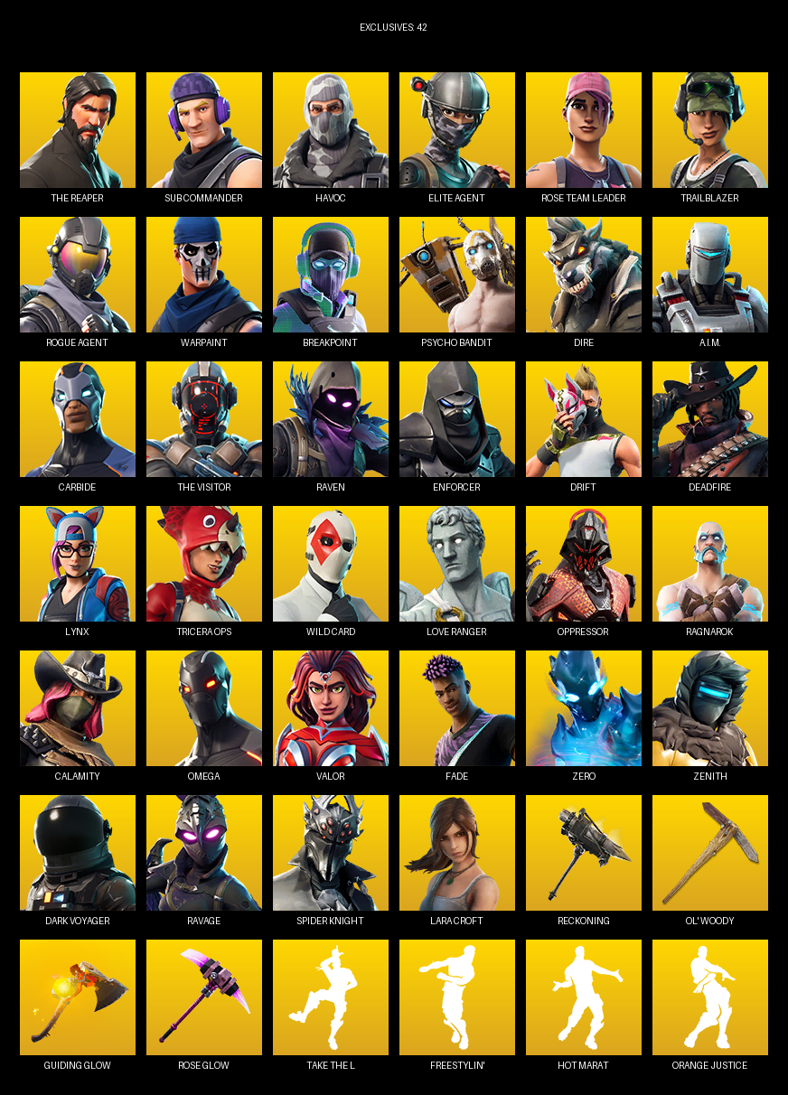 The Reaper, Elite Agent, Omega, Lara Croft, Sub Commander, Havoc, Rose Team Leader, Trailblazer, Warpaint, Breakpoint, Psycho Bandit, Dire, A.I.M., Carbide, Raven, Enforcer, Drift, Deadfire