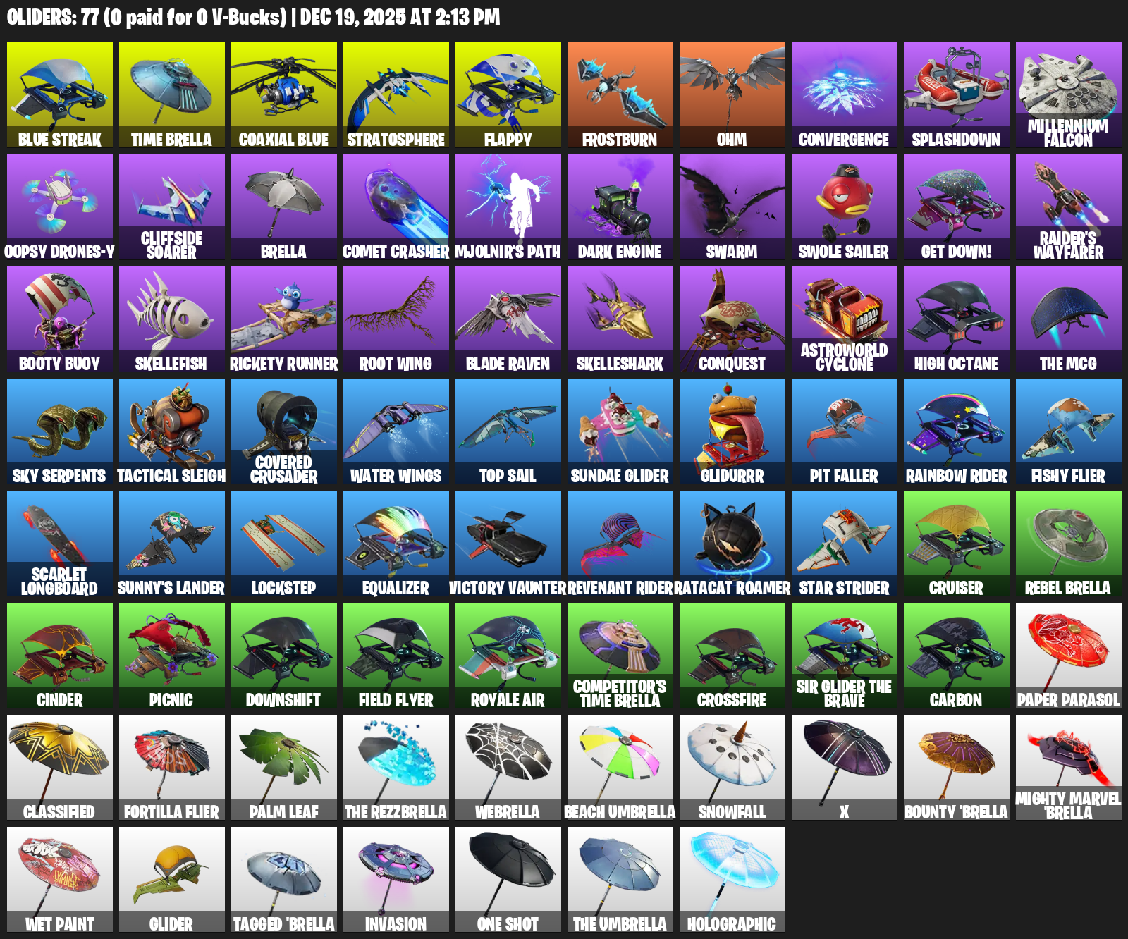 Time Brella, Stratosphere, Flappy, Frostburn, Ohm, Convergence, Splashdown, Millennium Falcon, Oopsy Drones-y, Cliffside Soarer, Comet Crasher, Mjolnir’s Path, Swarm, Swole Sailer, Get Down!, Raider’s Wayfarer