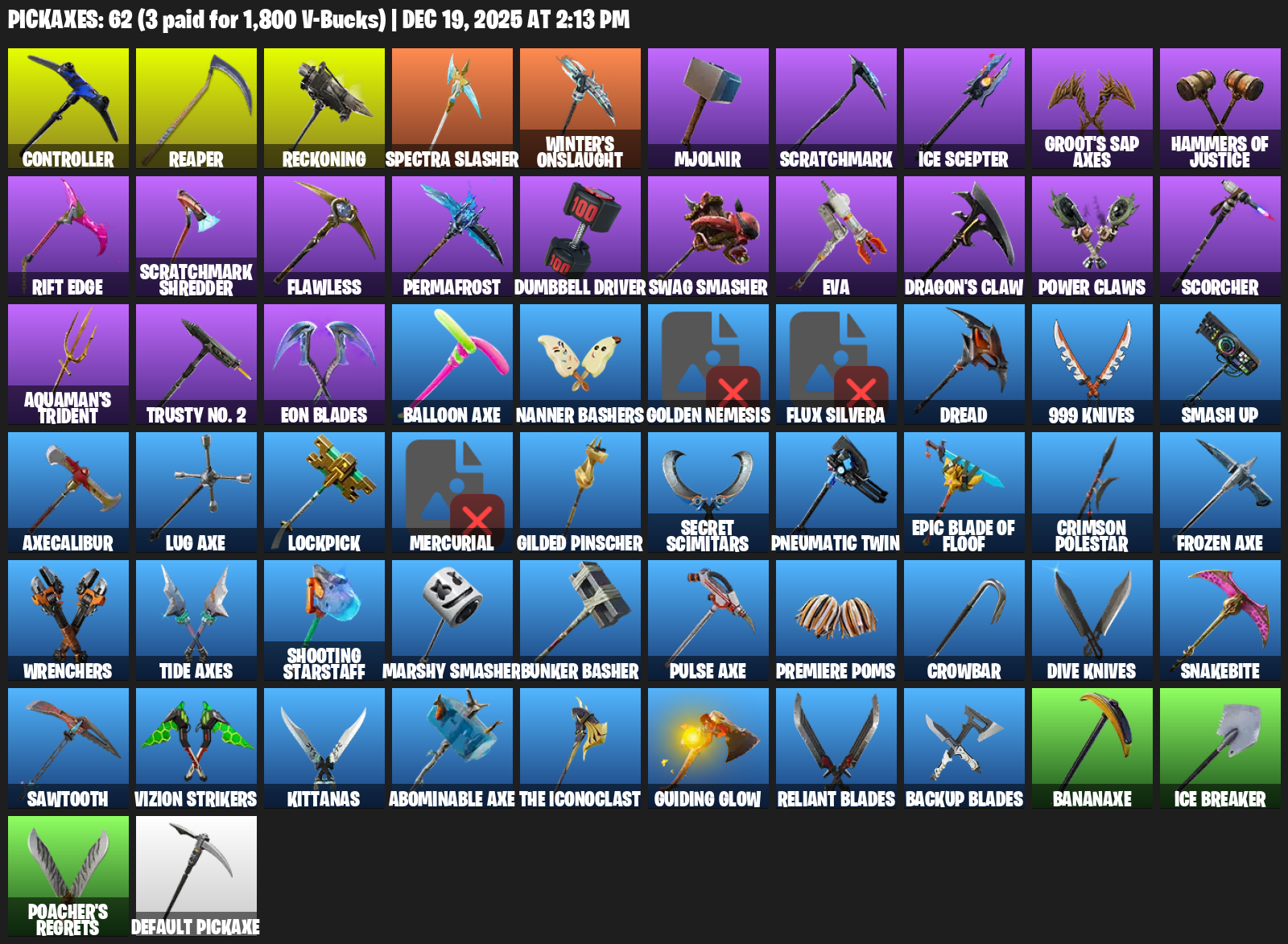 Controller, Reckoning, Spectra Slasher, Winter’s Onslaught, Mjolnir, Scratchmark, Ice Scepter, Groot’s Sap Axes, Hammers of Justice, Rift Edge, Flawless, Permafrost, Dumbbell Driver, Swag Smasher, EVA, Dragon’s Claw, Power Claws, Scorcher