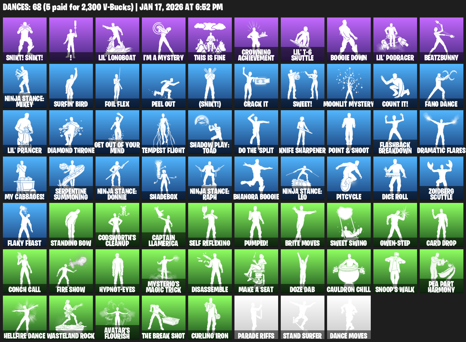 Snikt! Snikt!, !, Lil’ Longboat, I’m a Mystery, This is Fine, Crowning Achievement, Boogie Down, BeatzBunny, Ninja Stance: Mikey, Surfin’ Bird, Foil Flex, Peel Out, (Snikt!), Crack It, Sweet!, Count It!, Fang Dance