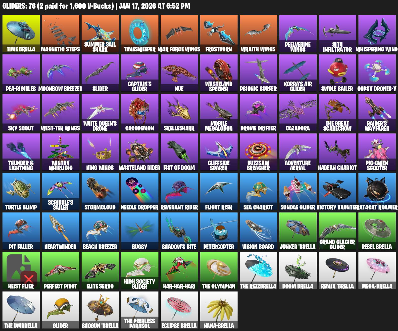 Time Brella, Magnetic Steps, Summer Sail Shark, Timesweeper, War Force Wings, Frostburn, Sith Infiltrator, Whispering Wind, Pea-rigibles, Moonbow Breezer, Slider, Captain’s Glider, Nue, Wasteland Speeder, Psionic Surfer, Swole Sailer, Oopsy Drones-y