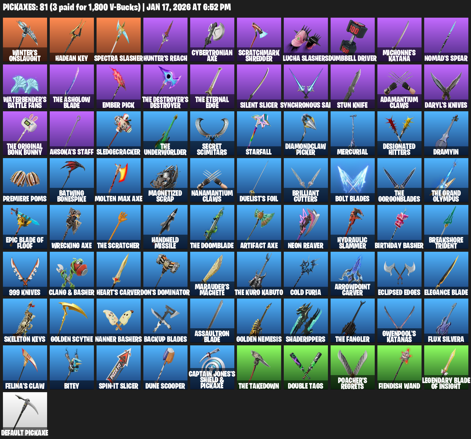 Winter’s Onslaught, Hadean Key, Hunter’s Reach, Cybertronian Axe, Scratchmark Shredder, Lucha Slashers, Dumbbell Driver, Michonne’s Katana, Nomad’s Spear, Waterbender’s Battle Fans, The Ashglow Blade, Ember Pick, Silent Slicer, Synchronous Sai, Stun Knife, Adamantium Claws, Daryl’s Knives