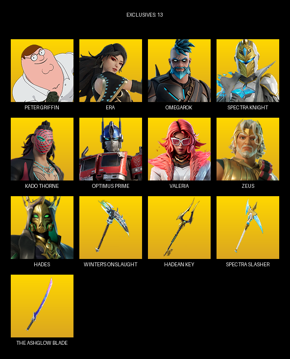 Peter Griffin, Era, Omegarok, Spectra Knight, Kado Thorne, Optimus Prime, Valeria, Zeus, Hades, Megalo Don, Montague, Renegade Lynx, Peabody, Aphrodite, Trace, Poseidon, Wastelander Magneto, Captain Jones, Oscar