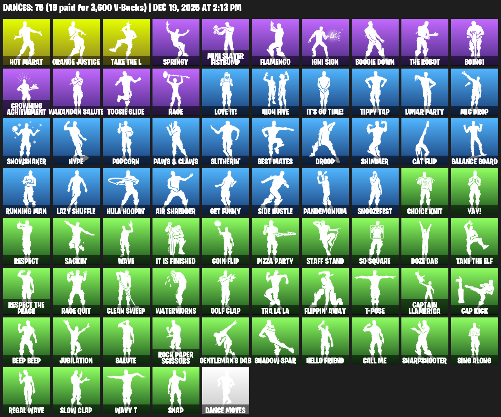 Hot Marat, Orange Justice, Springy, Mini Slayer Fistbump, Flamenco, Igni Sign, Boogie Down, Boing!, Crowning Achievement, Wakandan Salute, Toosie Slide, Rage, High Five, It’s Go Time!, Tippy Tap, Lunar Party, Mic Drop
