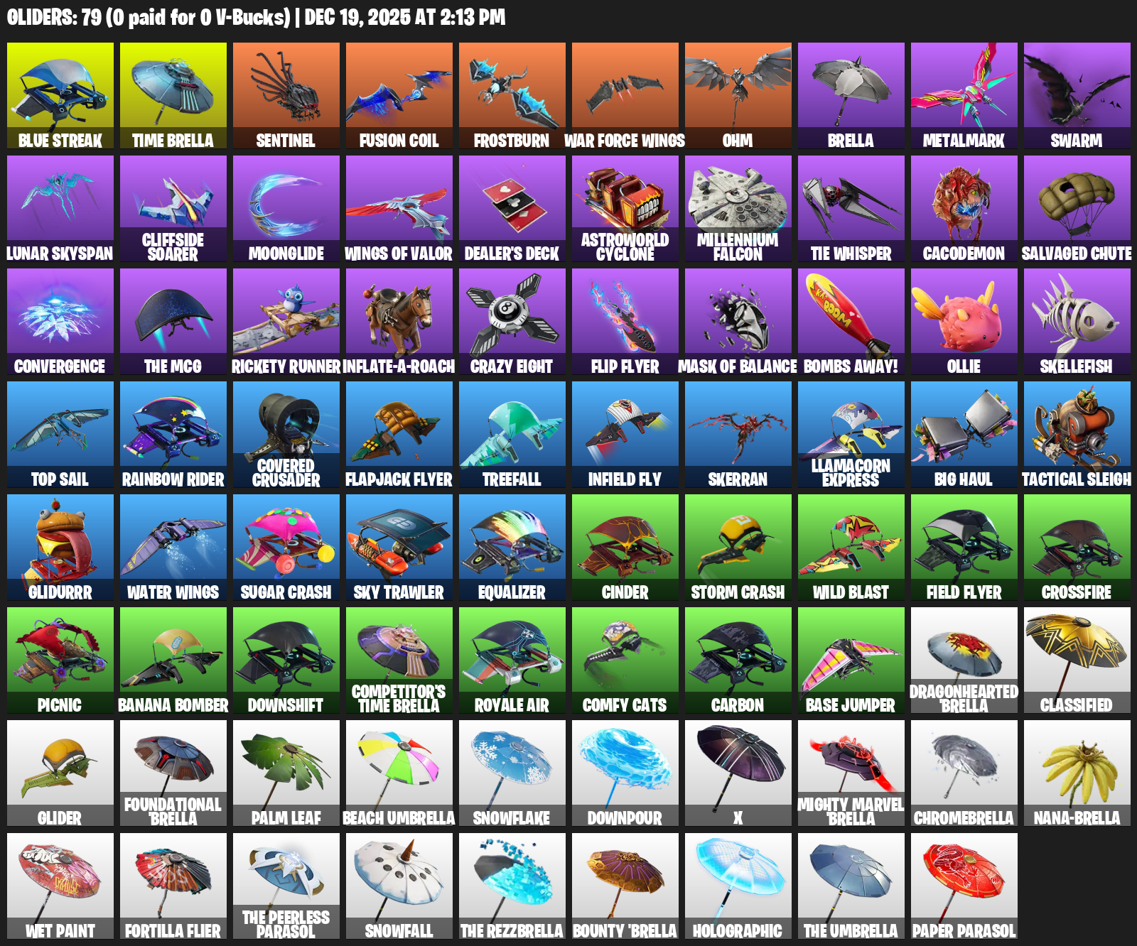 Time Brella, Sentinel, Frostburn, War Force Wings, Ohm, Metalmark, Swarm, Cliffside Soarer, Moonglide, Dealer’s Deck, Astroworld Cyclone, Millennium Falcon, TIE Whisper, Cacodemon, Salvaged Chute