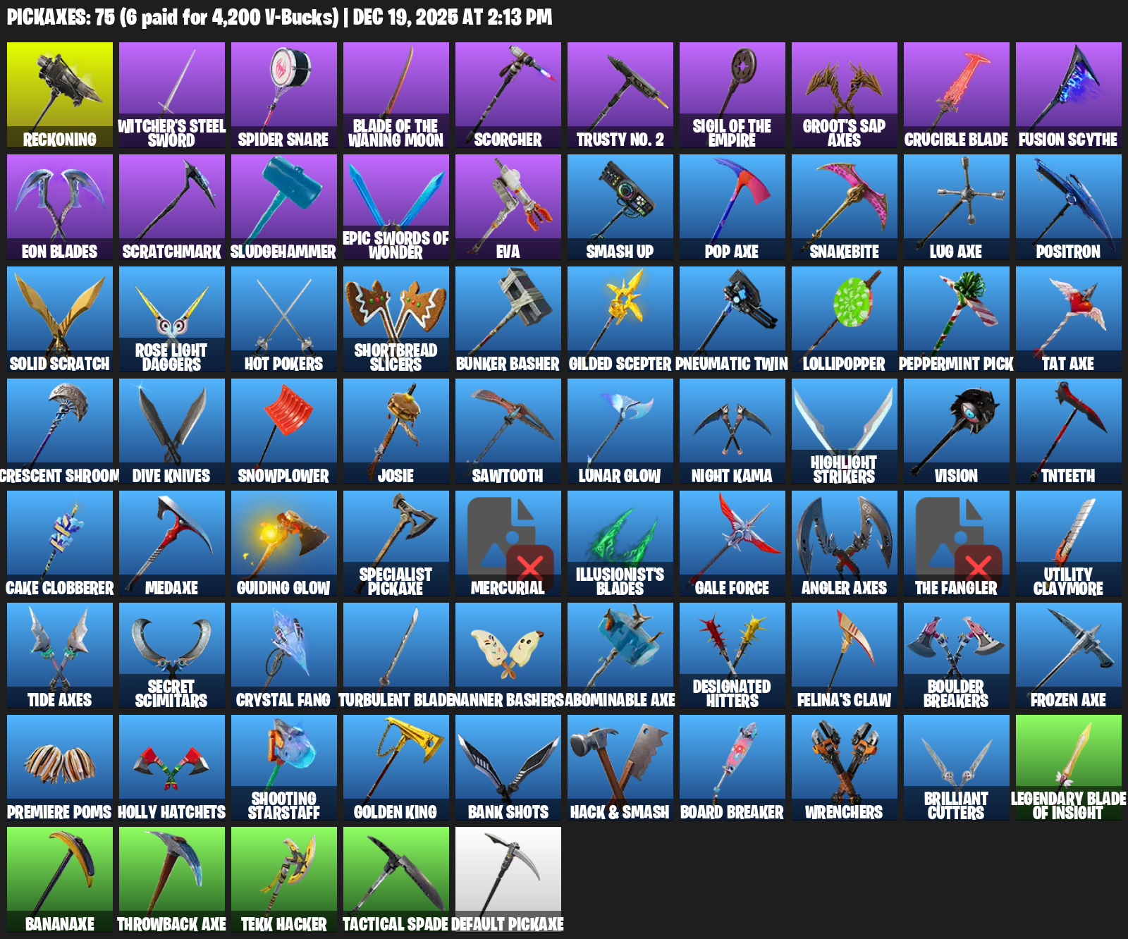 Reckoning, Witcher’s Steel Sword, Scorcher, Trusty No. 2, Groot’s Sap Axes, Crucible Blade, Eon Blades, Scratchmark, Sludgehammer, EVA, Smash Up, Pop Axe, Snakebite, Positron