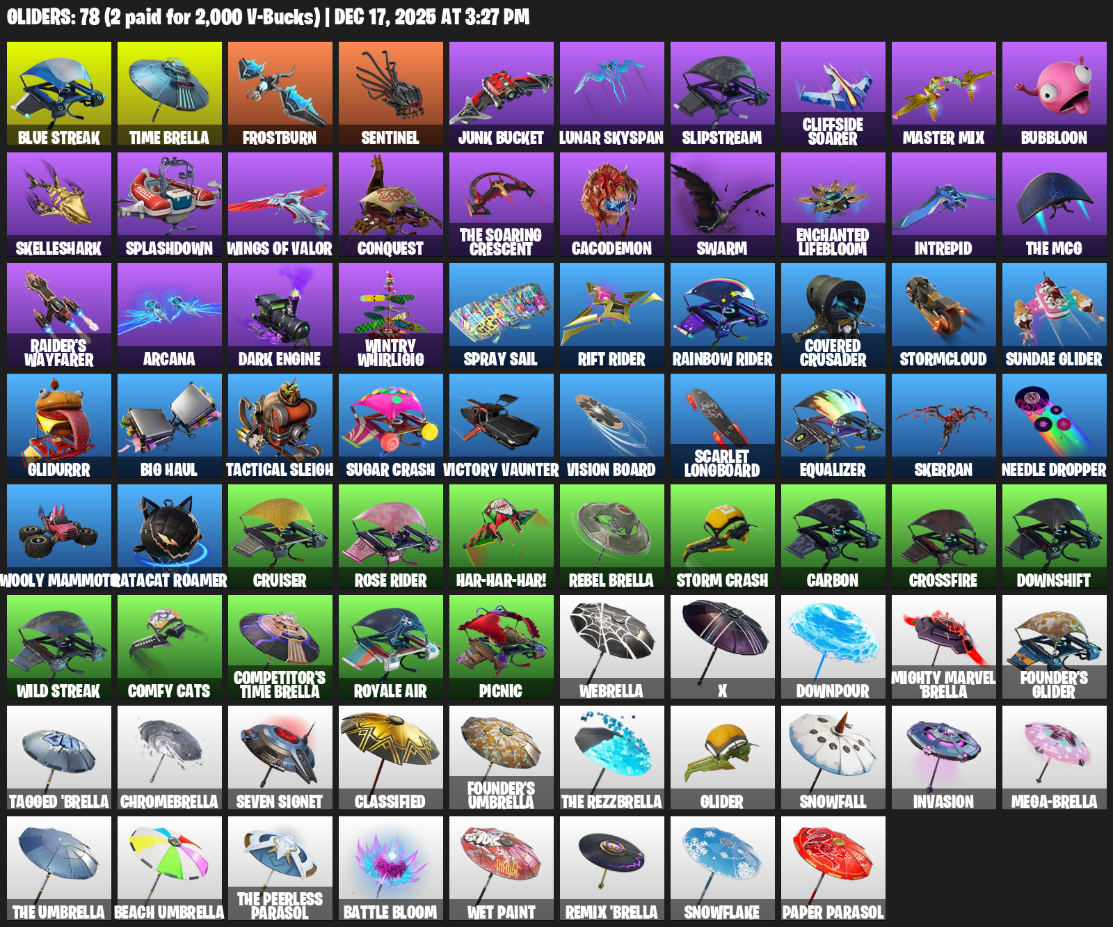 Blue Streak, Time Brella, Frostburn, Sentinel, Junk Bucket, Lunar Skyspan, Slipstream, Cliffside Soarer, Master Mix, Bubbloon, Skelleshark, Splashdown, Wings of Valor, Conquest, Cacodemon, Swarm, Enchanted Lifebloom, Intrepid
