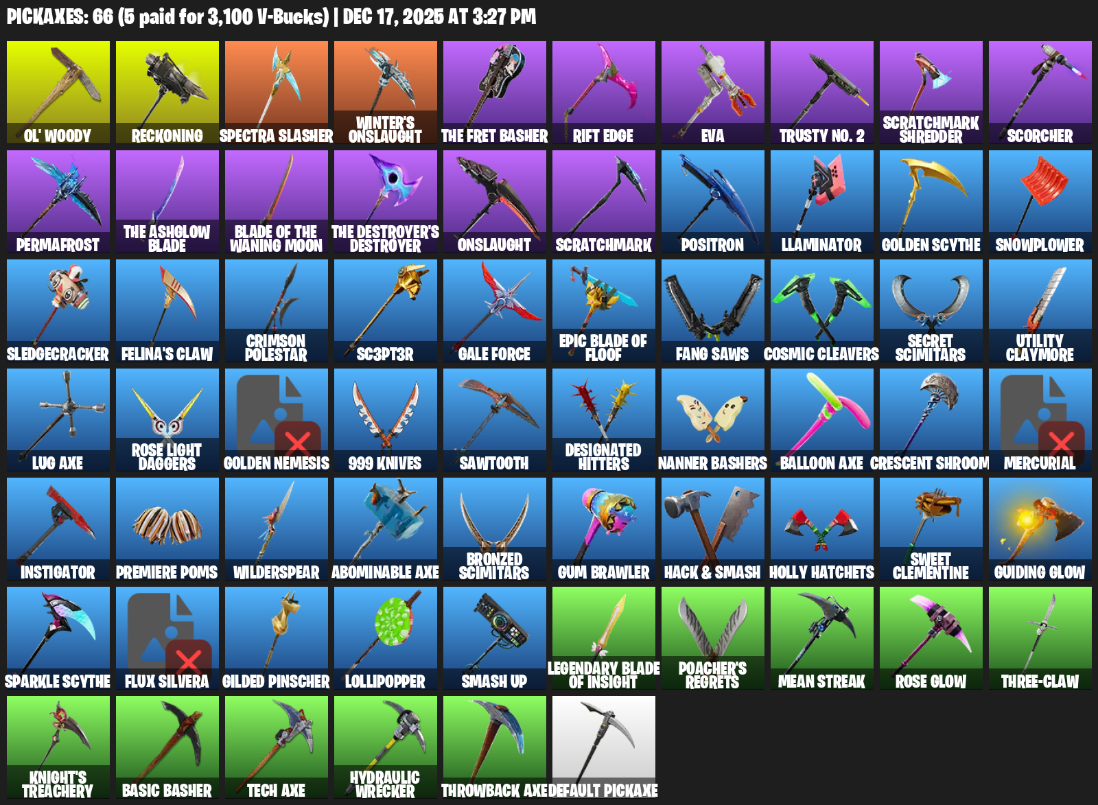 Ol’ Woody, Reckoning, Winter’s Onslaught, Rift Edge, EVA, Trusty No. 2, Scratchmark Shredder, Scorcher, Permafrost, Positron, Llaminator, Golden Scythe, Snowplower