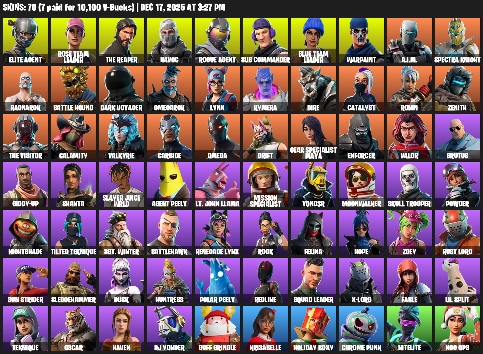 Elite Agent, The Reaper, Omega, Gear Specialist Maya, Rose Team Leader, Havoc, Sub Commander, Warpaint, A.I.M., Spectra Knight, Ragnarok, Battle Hound, Dark Voyager, Omegarok, Lynx, Kymera, Dire, Catalyst