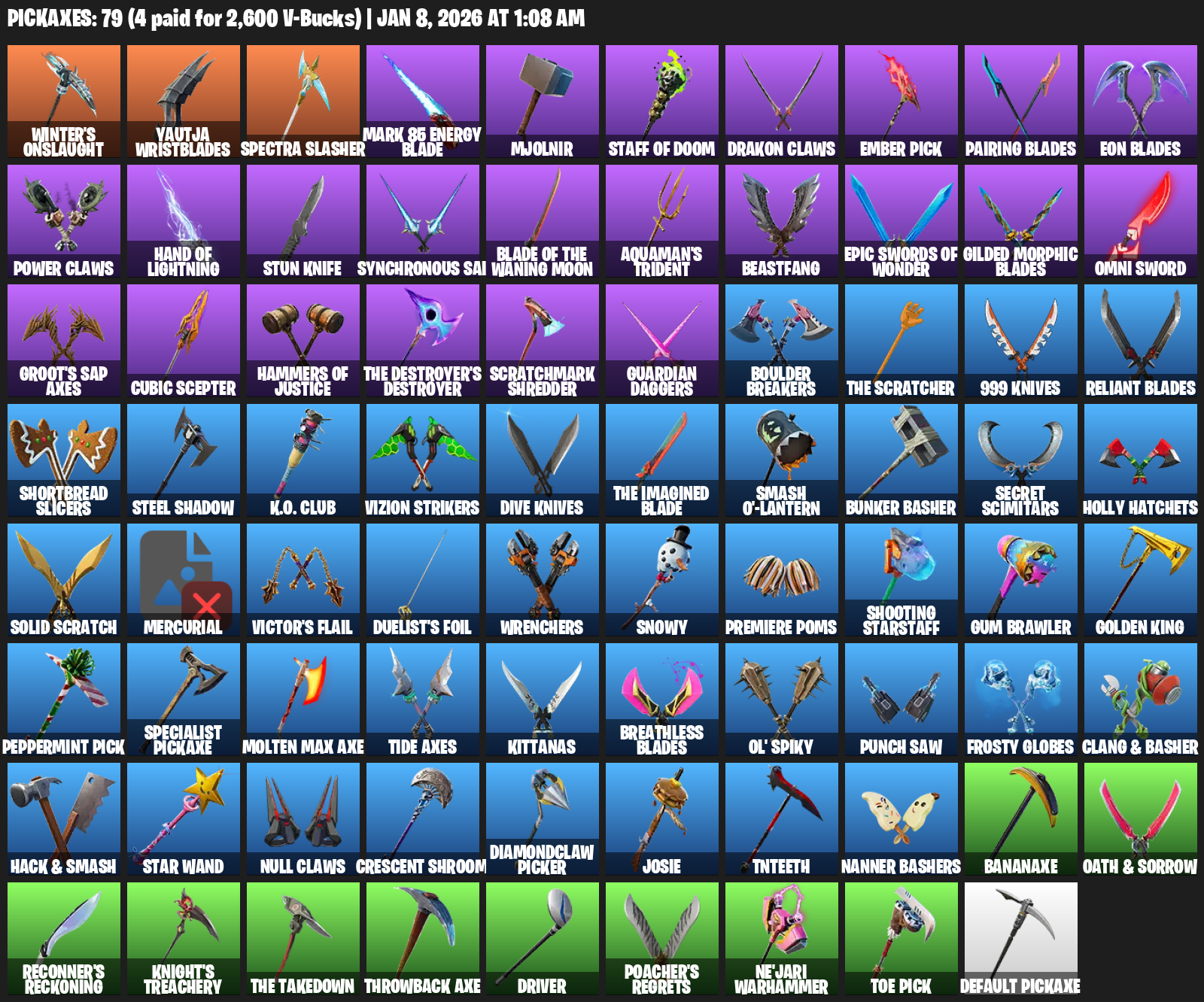 Winter’s Onslaught, Yautja Wristblades, Mark 85 Energy Blade, Mjolnir, Drakon Claws, Ember Pick, Pairing Blades, Hand of Lightning, Stun Knife, Synchronous Sai, Aquaman’s Trident, Beastfang, Omni Sword