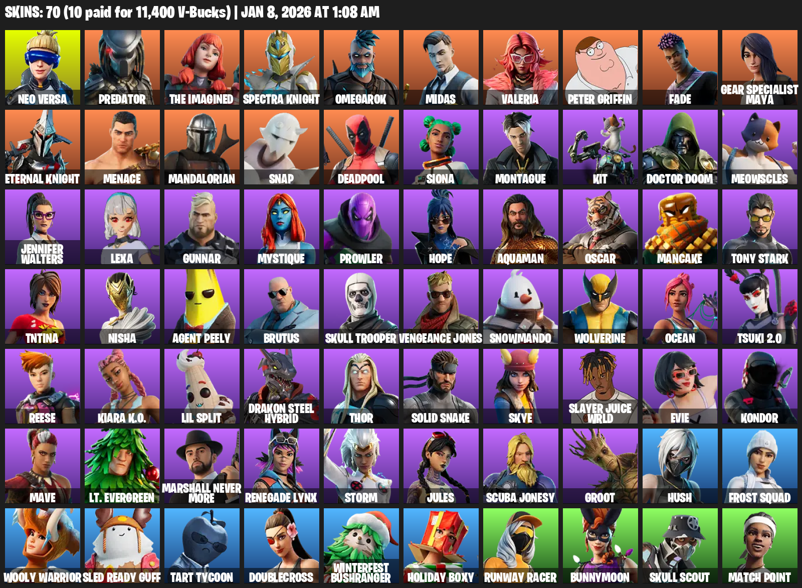 Gear Specialist Maya, Neo Versa, Predator, The Imagined, Spectra Knight, Omegarok, Midas, Valeria, Peter Griffin, Fade, Menace, Mandalorian, Snap, Deadpool, Siona, Montague, Kit, Doctor Doom, Meowscles