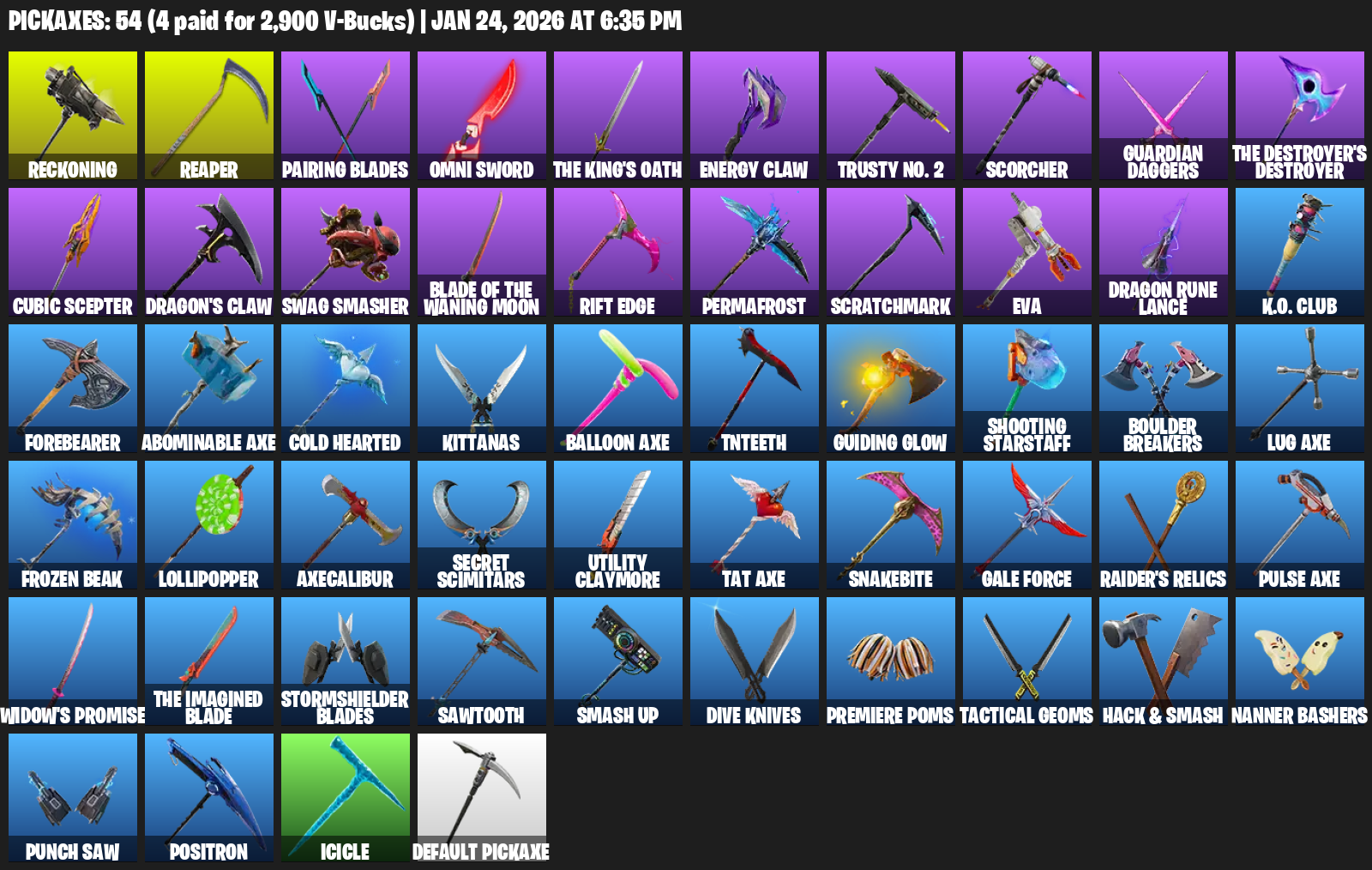 Reckoning, Pairing Blades, Omni Sword, Energy Claw, Trusty No. 2, Scorcher, Guardian Daggers, Cubic Scepter, Swag Smasher, Rift Edge, Permafrost, Scratchmark, EVA, Dragon Rune Lance, K.O. Club