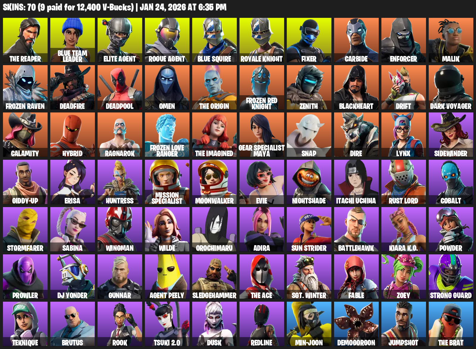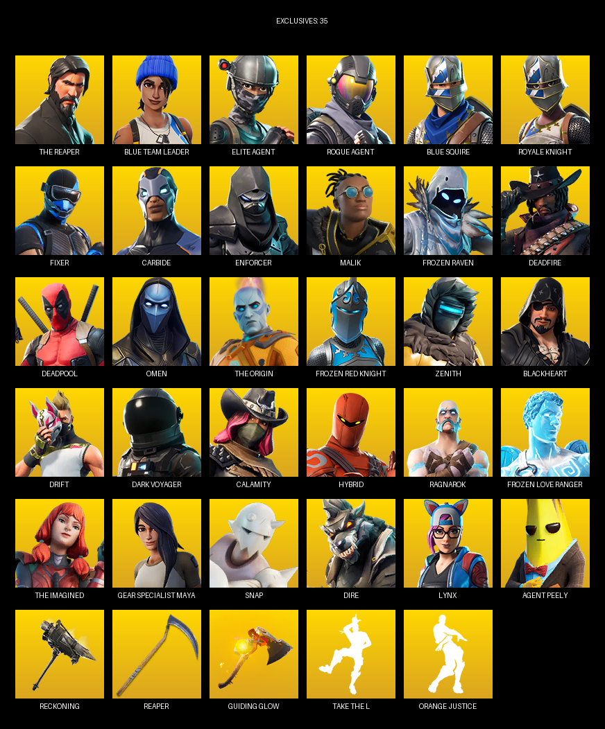 The Reaper, Elite Agent, Blue Squire, Royale Knight, Gear Specialist Maya, Fixer, Carbide, Enforcer, Malik, Frozen Raven, Deadfire, Deadpool, Omen, Zenith, Blackheart, Drift