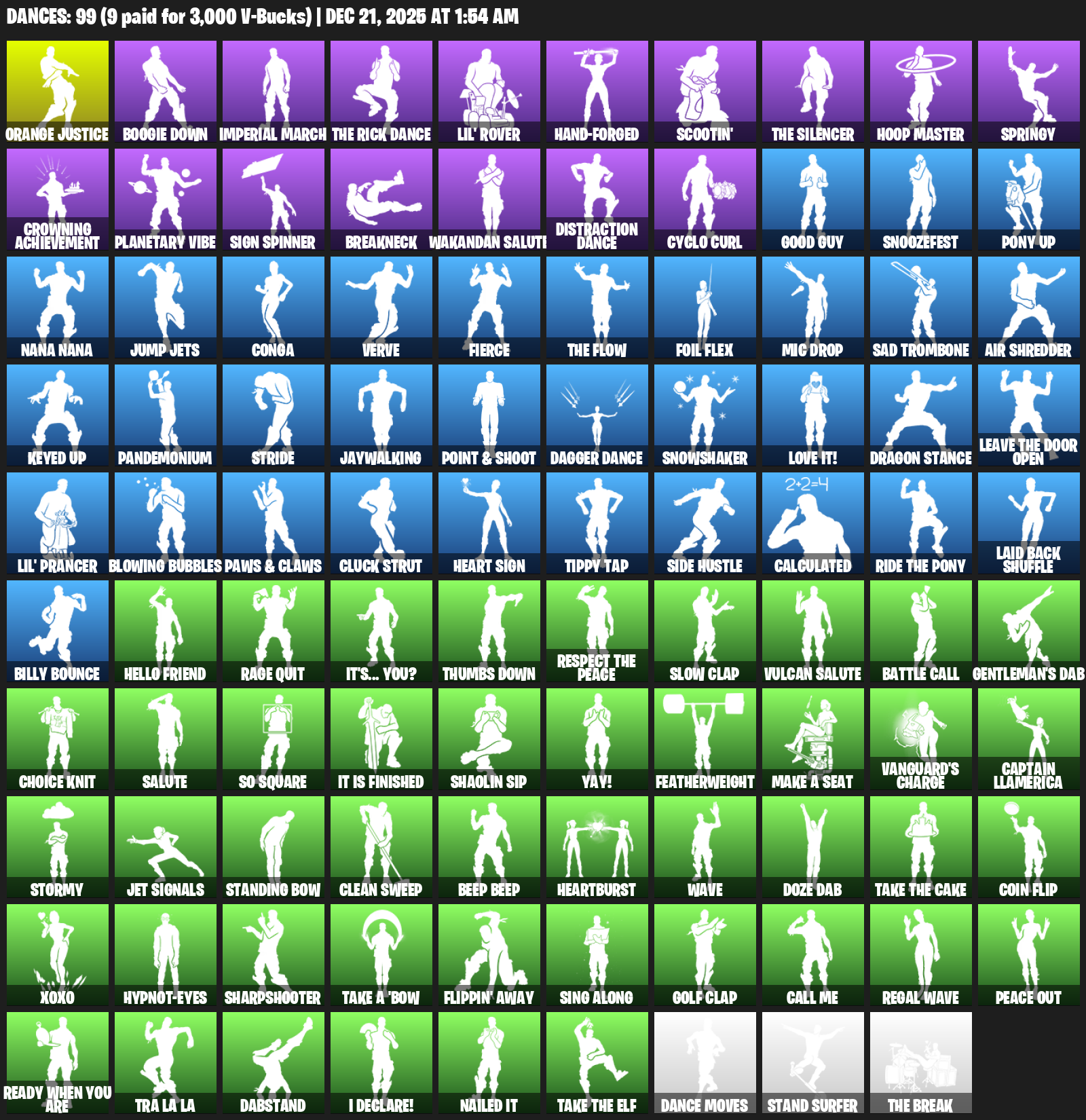Orange Justice, Boogie Down, Imperial March, Lil’ Rover, Scootin’, Hoop Master, Springy, Crowning Achievement, Planetary Vibe, Sign Spinner, Breakneck, Wakandan Salute, Distraction Dance, Cyclo Curl, Good Guy, Snoozefest, Pony Up
