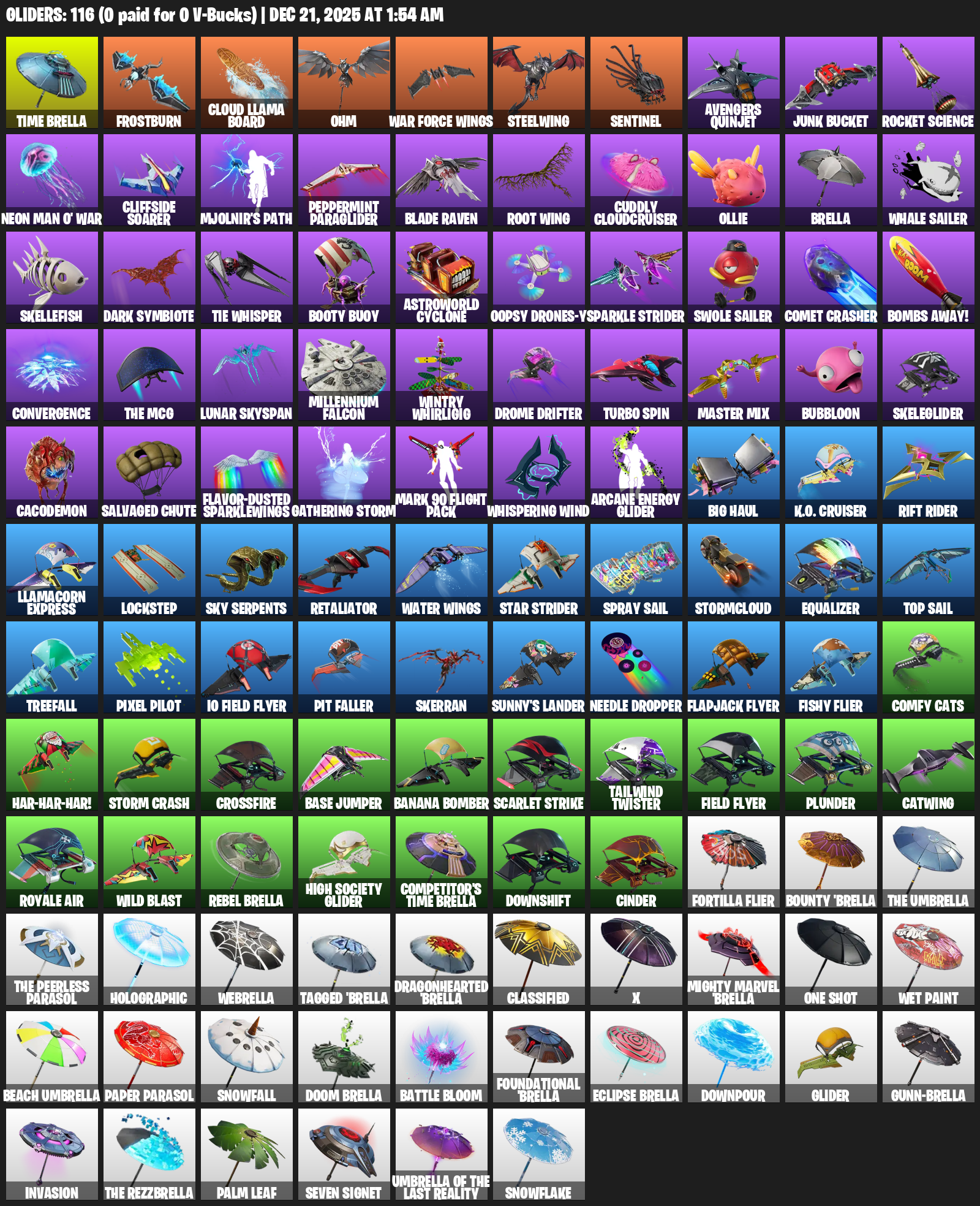 Time Brella, Frostburn, Cloud Llama Board, Ohm, War Force Wings, Steelwing, Avengers Quinjet, Junk Bucket, Rocket Science, Cliffside Soarer, Mjolnir’s Path, Peppermint Paraglider, Root Wing, Cuddly Cloudcruiser, Ollie, Whale Sailer