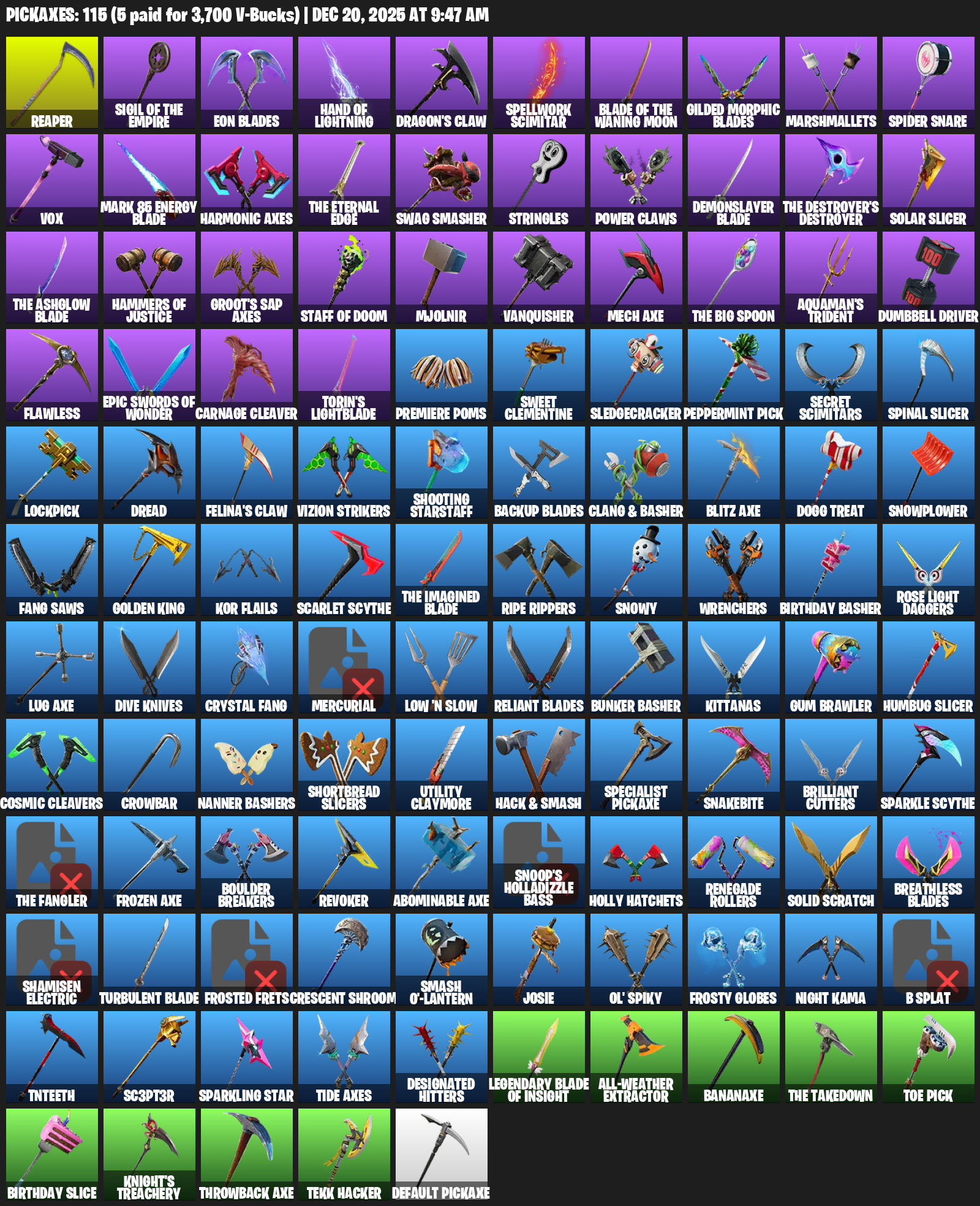 Reaper, Eon Blades, Hand of Lightning, Dragon’s Claw, Spellwork Scimitar, Marshmallets, Spider Snare, Vox, Mark 85 Energy Blade, Harmonic Axes, Swag Smasher, Stringles, Power Claws, Solar Slicer
