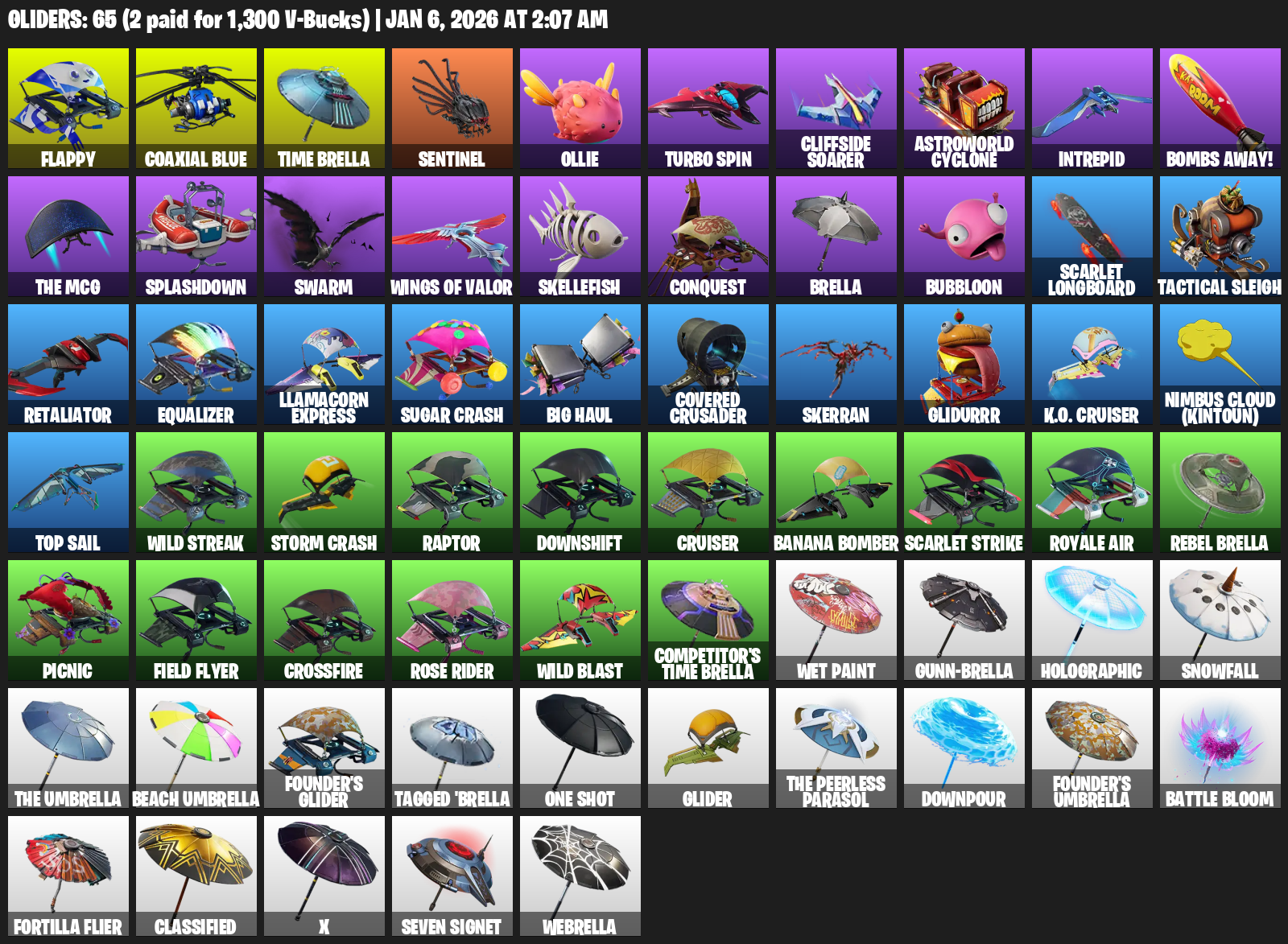 Flappy, Time Brella, Ollie, Turbo Spin, Cliffside Soarer, Astroworld Cyclone, Intrepid, Bombs Away!, Splashdown, Swarm, Skellefish, Conquest, Bubbloon, Scarlet Longboard, Tactical Sleigh