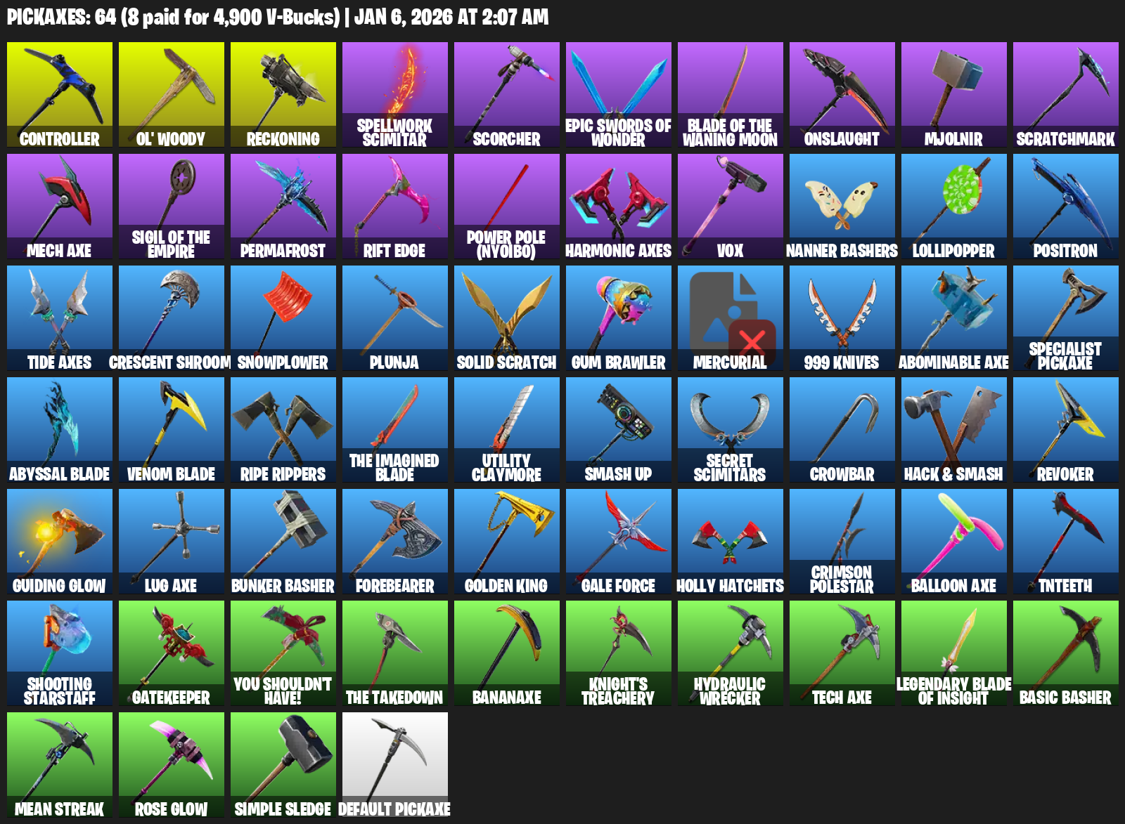 Controller, Ol’ Woody, Reckoning, Spellwork Scimitar, Scorcher, Blade of the Waning Moon, Onslaught, Mjolnir, Scratchmark, Mech Axe, Permafrost, Rift Edge, Power Pole (Nyoibo), Harmonic Axes, Vox, Nanner Bashers, Lollipopper, Positron