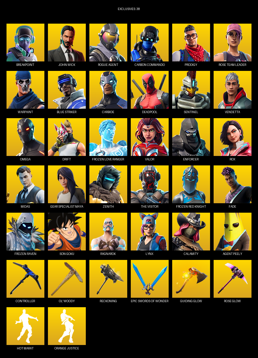Omega, Gear Specialist Maya, Breakpoint, John Wick, Rogue Agent, Carbon Commando, Prodigy, Rose Team Leader, Warpaint, Blue Striker, Carbide, Deadpool, Sentinel, Vendetta, Drift, Frozen Love Ranger, Valor, Enforcer, Rox, Midas