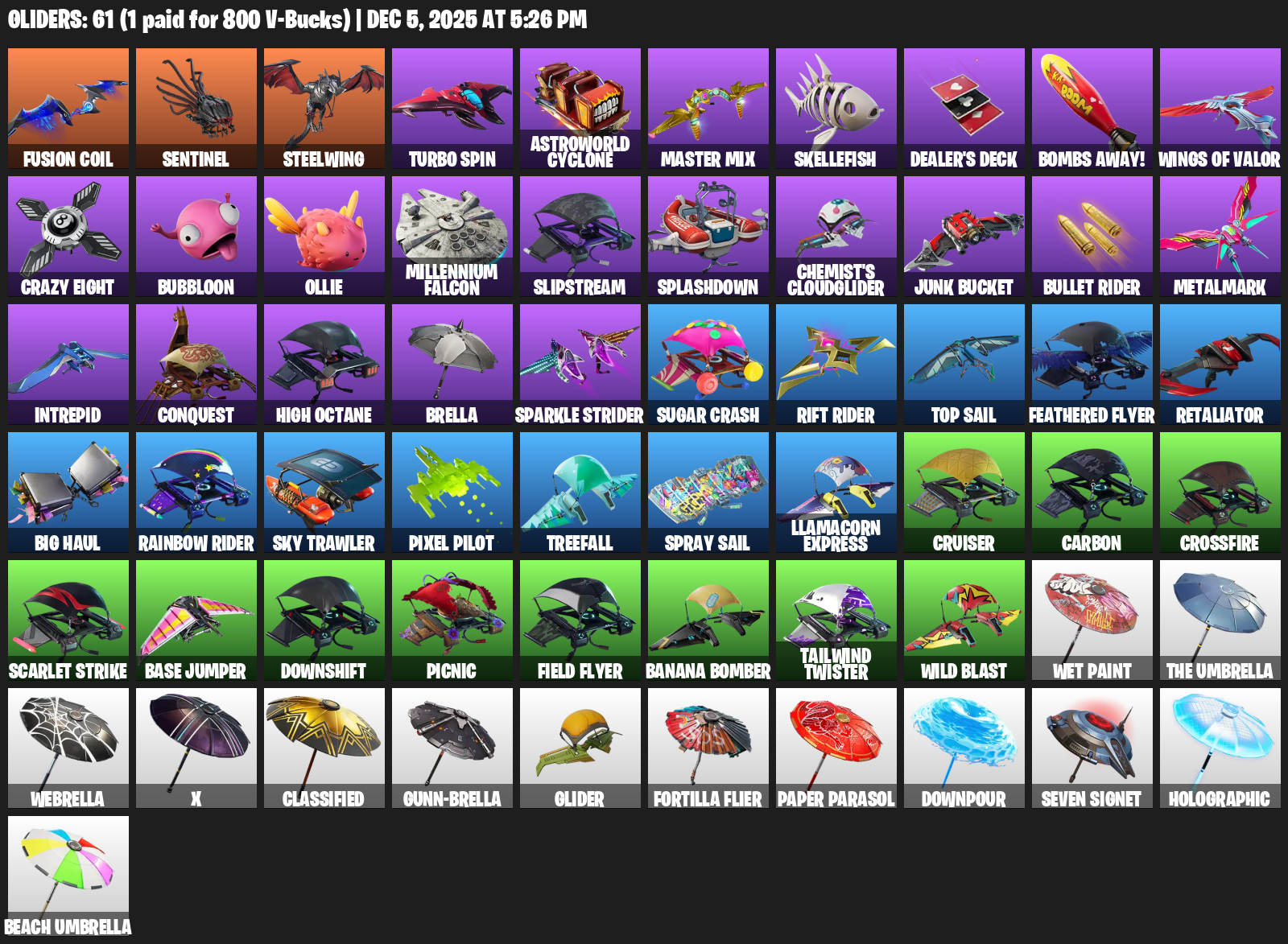 Steelwing, Turbo Spin, Astroworld Cyclone, Master Mix, Skellefish, Dealer’s Deck, Bombs Away!, Wings of Valor, Crazy Eight, Bubbloon, Ollie, Millennium Falcon, Slipstream, Splashdown, Chemist’s Cloudglider, Junk Bucket, Bullet Rider, Metalmark