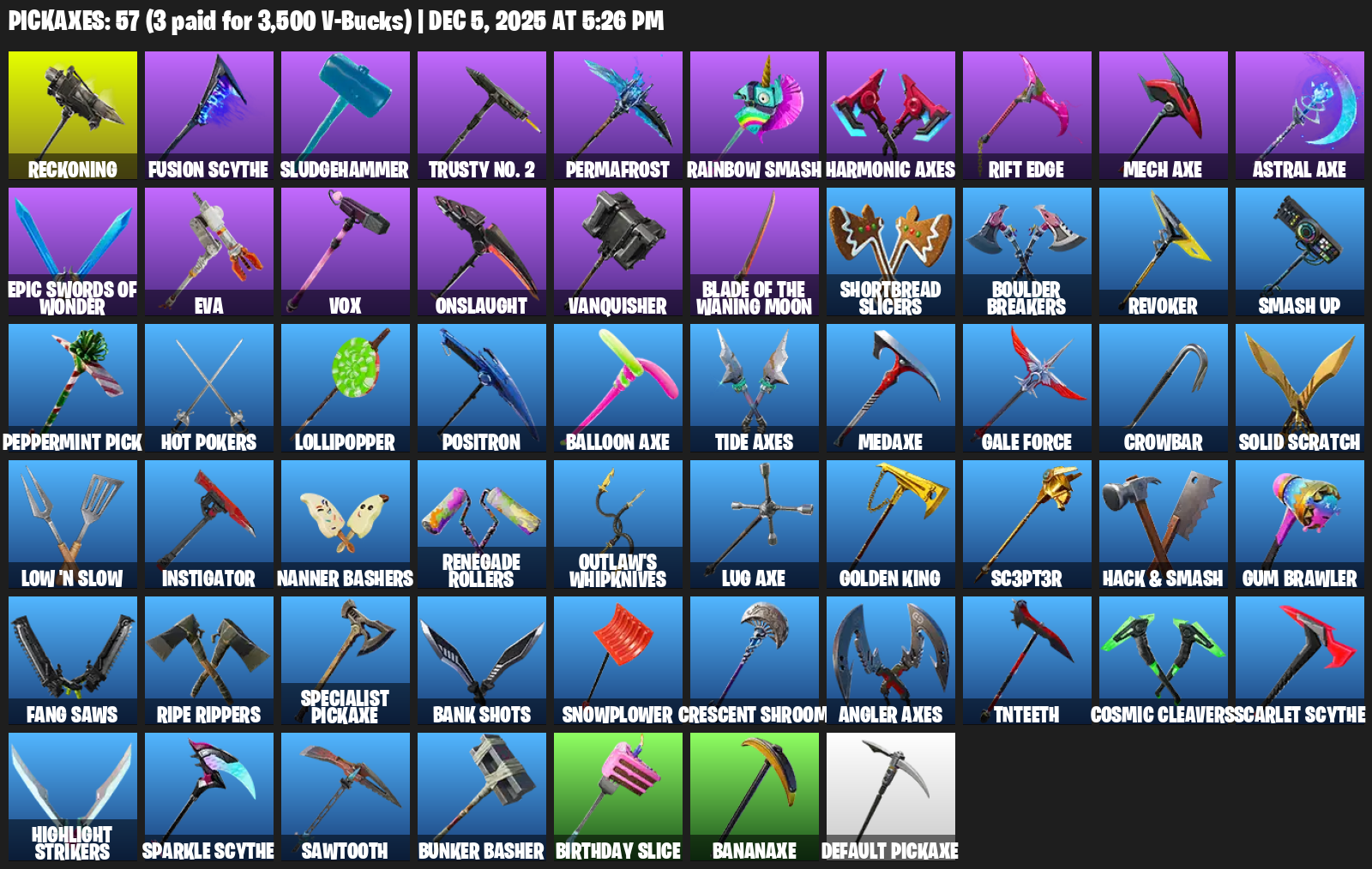 Reckoning, Fusion Scythe, Sludgehammer, Trusty No. 2, Permafrost, Rainbow Smash, Harmonic Axes, Rift Edge, Mech Axe, EVA, Vox, Onslaught, Vanquisher, Shortbread Slicers, Boulder Breakers, Revoker