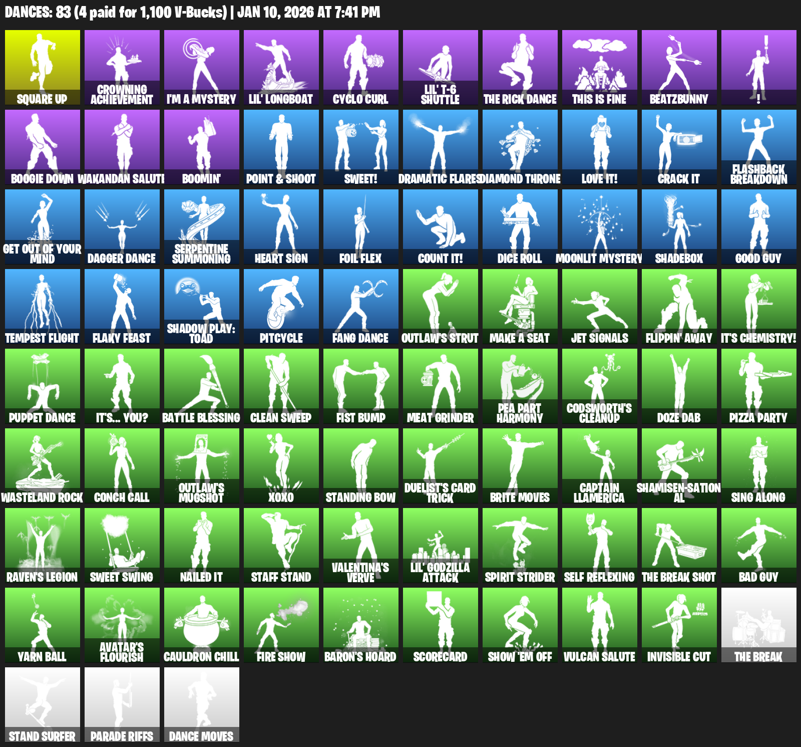 Square Up, Crowning Achievement, I’m a Mystery, Lil’ Longboat, Cyclo Curl, This is Fine, BeatzBunny, !, Boogie Down, Wakandan Salute, Boomin’, Sweet!, Dramatic Flares, Diamond Throne, Love it!, Crack It, Flashback Breakdown