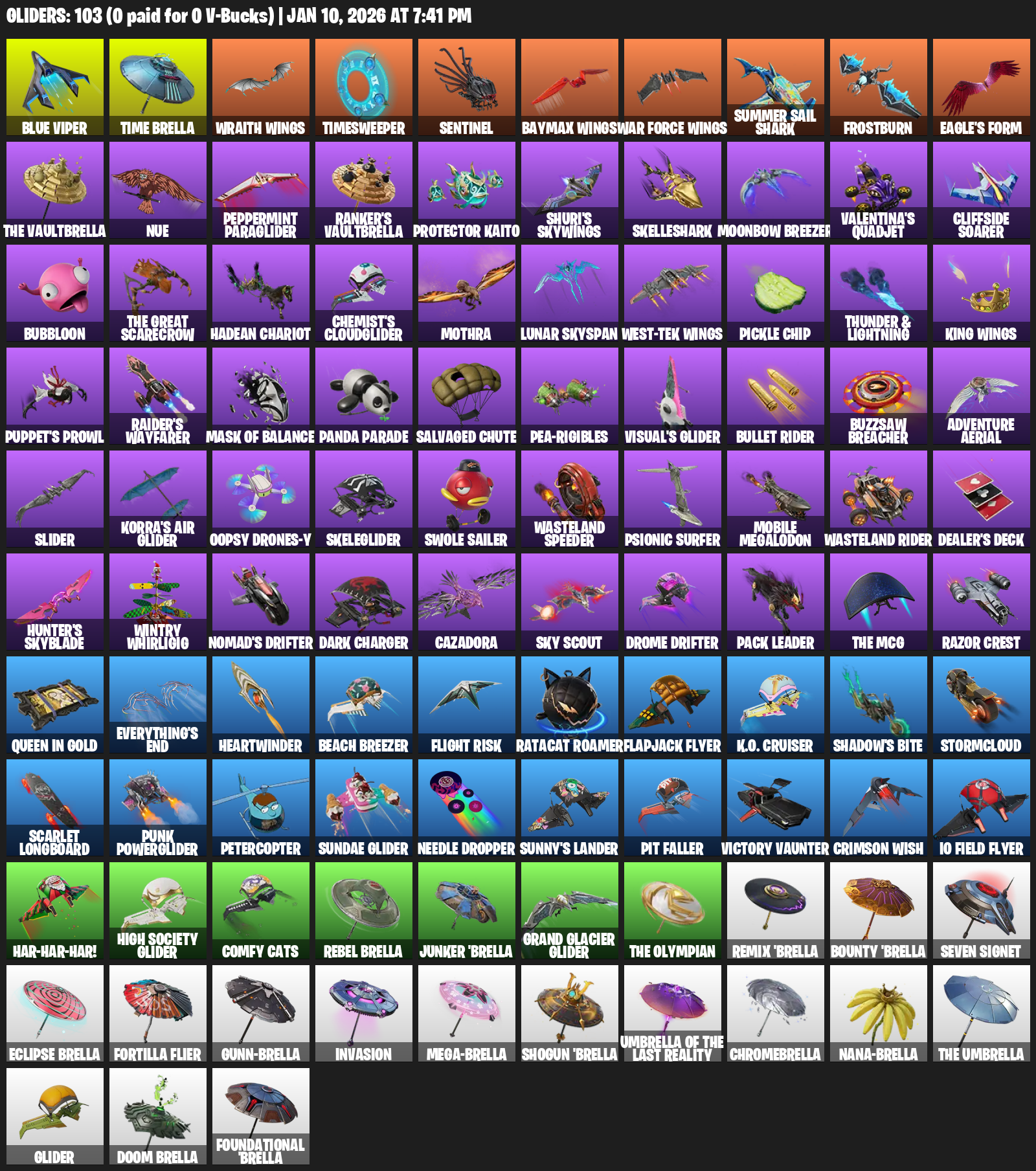 Blue Viper, Time Brella, Wraith Wings, Timesweeper, Sentinel, Summer Sail Shark, Frostburn, Eagle’s Form, Nue, Peppermint Paraglider, Ranker’s Vaultbrella, Protector Kaito, Shuri’s Skywings, Skelleshark, Moonbow Breezer, Valentina’s Quadjet, Cliffside Soarer