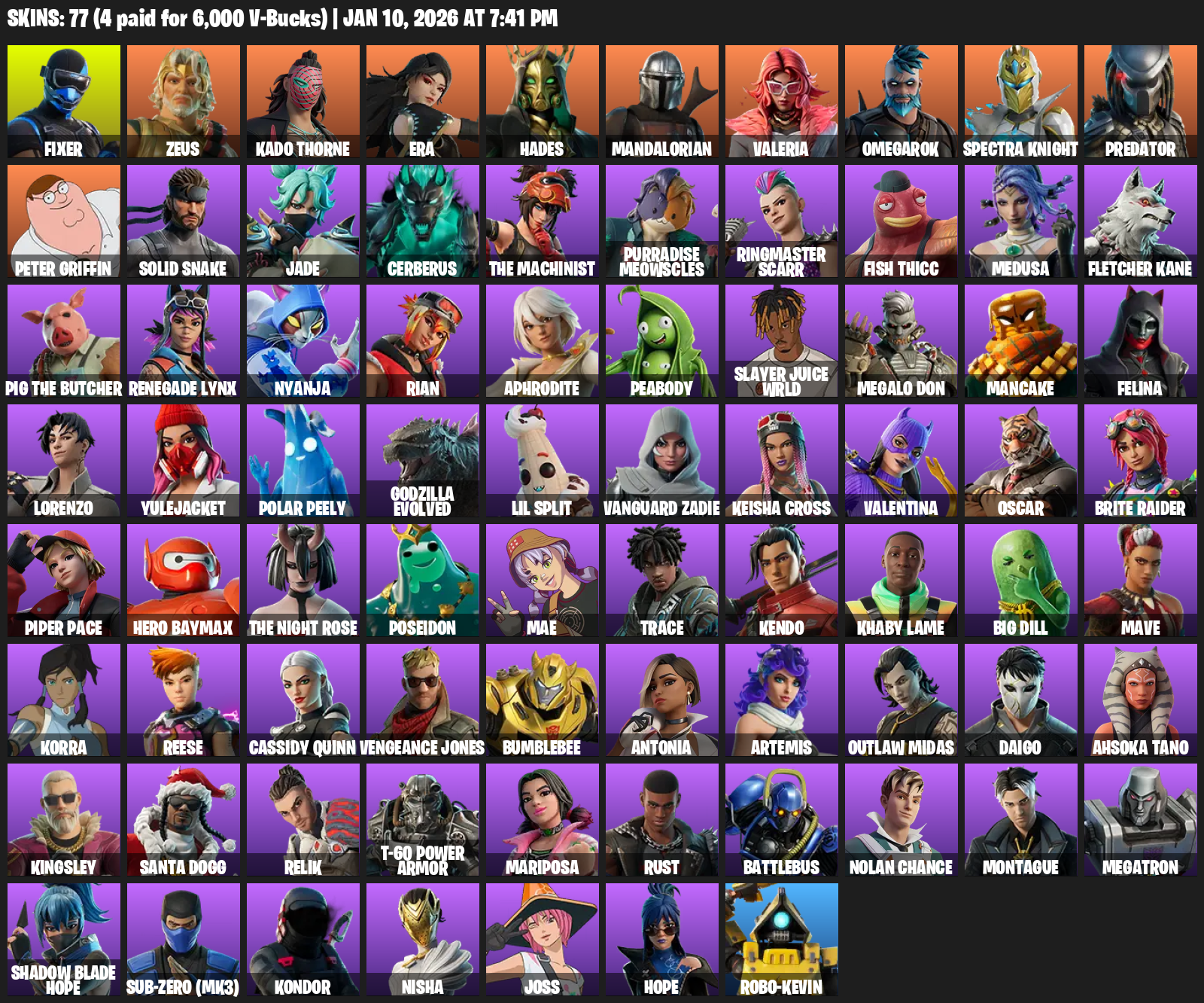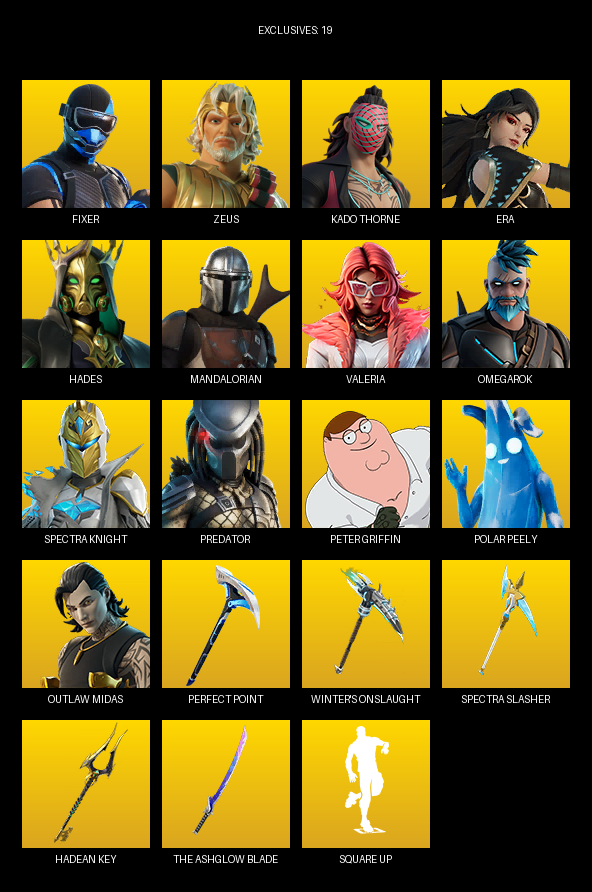 Fixer, Zeus, Kado Thorne, Era, Hades, Mandalorian, Valeria, Omegarok, Spectra Knight, Predator, Peter Griffin, Solid Snake, Jade, Cerberus, The Machinist, Purradise Meowscles, Ringmaster Scarr, Fish Thicc, Medusa, Fletcher Kane