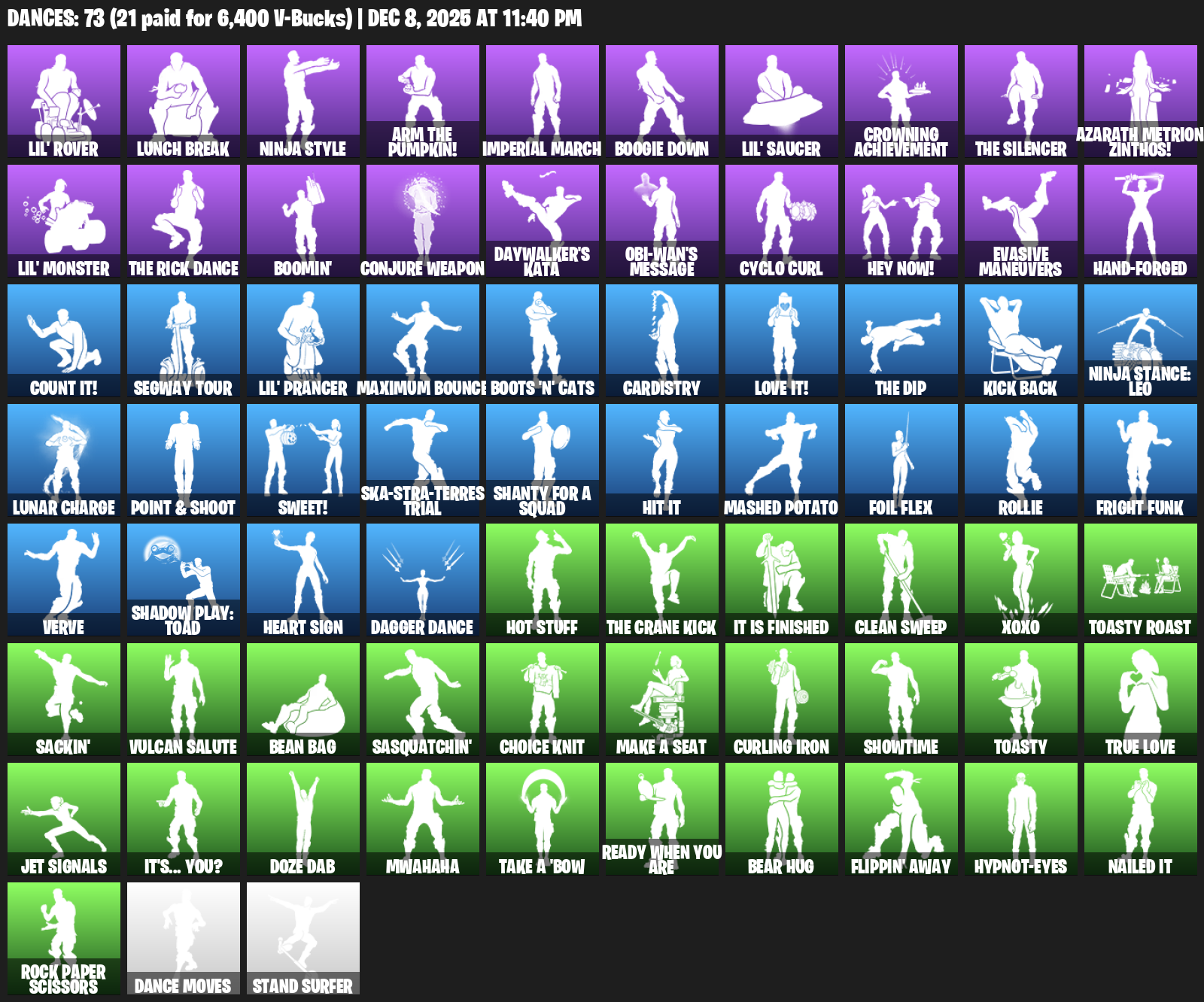 Lil’ Rover, Lunch Break, Ninja Style, Imperial March, Boogie Down, Crowning Achievement, Azarath Metrion Zinthos!, Boomin’, Conjure Weapon, Daywalker’s Kata, Obi-Wan’s Message, Cyclo Curl, Hey Now!, Evasive Maneuvers, Hand-Forged