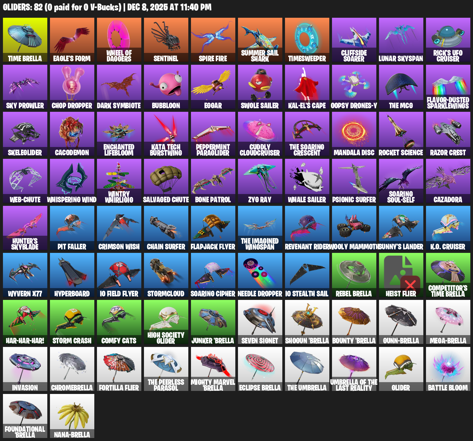 Time Brella, Eagle’s Form, Sentinel, Summer Sail Shark, Timesweeper, Cliffside Soarer, Lunar Skyspan, Rick’s UFO Cruiser, Sky Prowler, Chop Dropper, Dark Symbiote, Bubbloon, Eggar, Swole Sailer, Kal-El’s Cape, Oopsy Drones-y, Flavor-Dusted Sparklewings