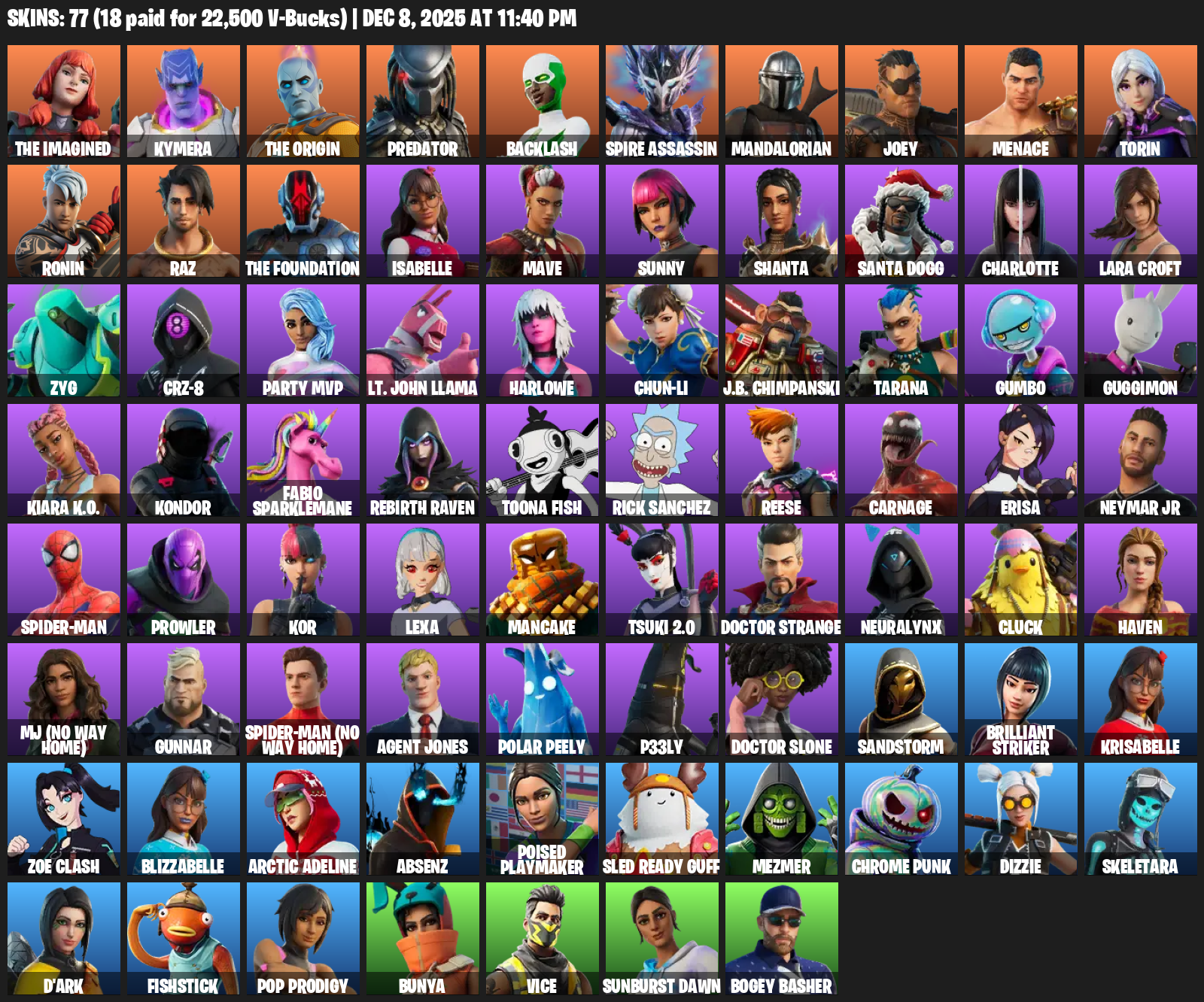 Lara Croft, The Imagined, Kymera, Predator, Backlash, Spire Assassin, Mandalorian, Joey, Menace, Torin, Ronin, Raz, Isabelle, Mave, Sunny, Shanta, Santa Dogg, Charlotte