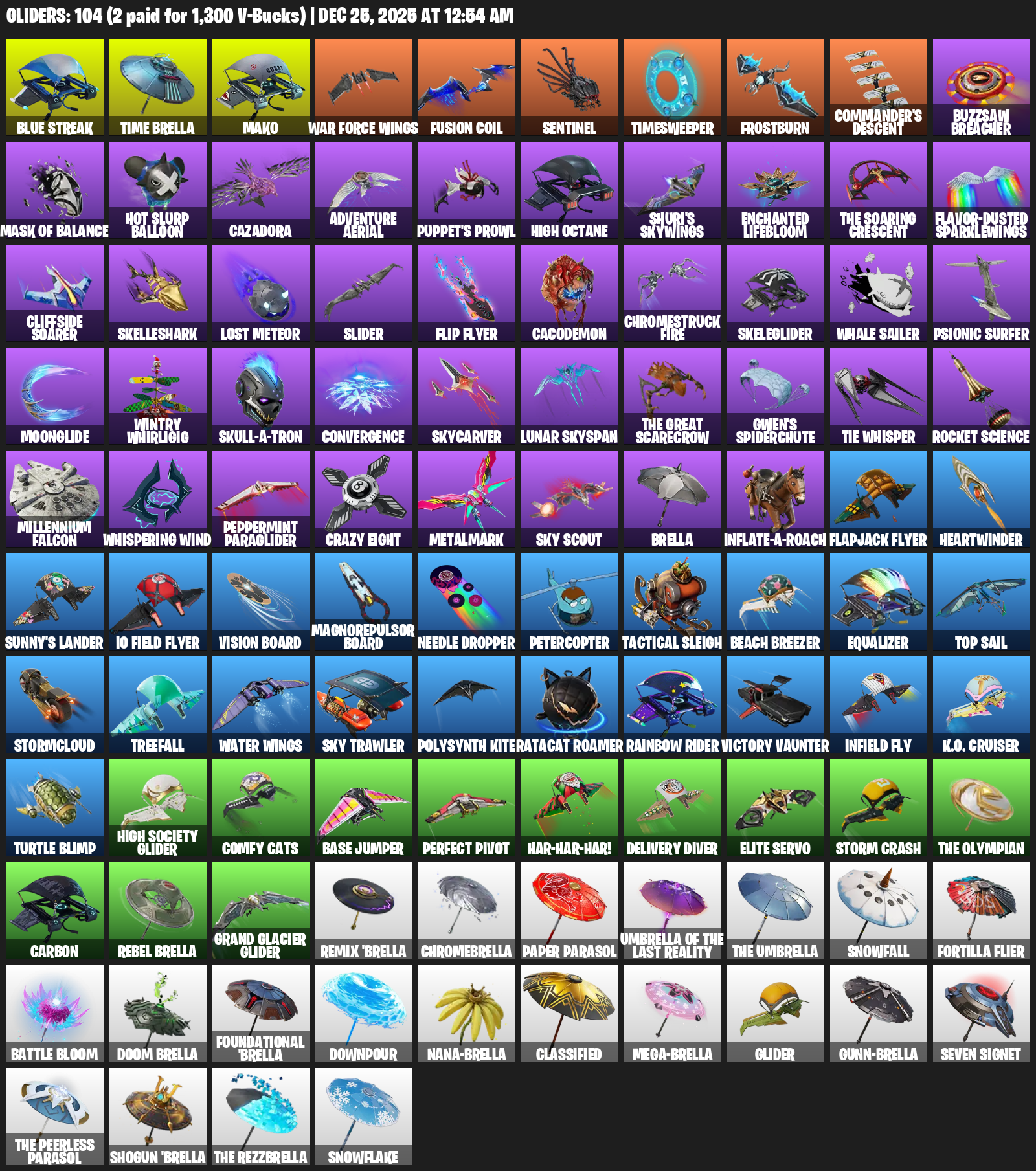 Mako, Time Brella, War Force Wings, Sentinel, Timesweeper, Frostburn, Commander’s Descent, Buzzsaw Breacher, Mask of Balance, Hot Slurp Balloon, Cazadora, Adventure Aerial, Puppet’s Prowl, High Octane, Shuri’s Skywings, Enchanted Lifebloom, Flavor-Dusted Sparklewings