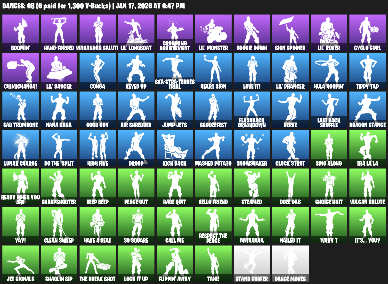 Boomin’, Hand-Forged, Wakandan Salute, Lil’ Longboat, Crowning Achievement, Boogie Down, Sign Spinner, Cyclo Curl, Chimichanga!, Conga, Keyed Up, Ska-stra-terrestrial, Love it!, Hula Hoopin’, Tippy Tap