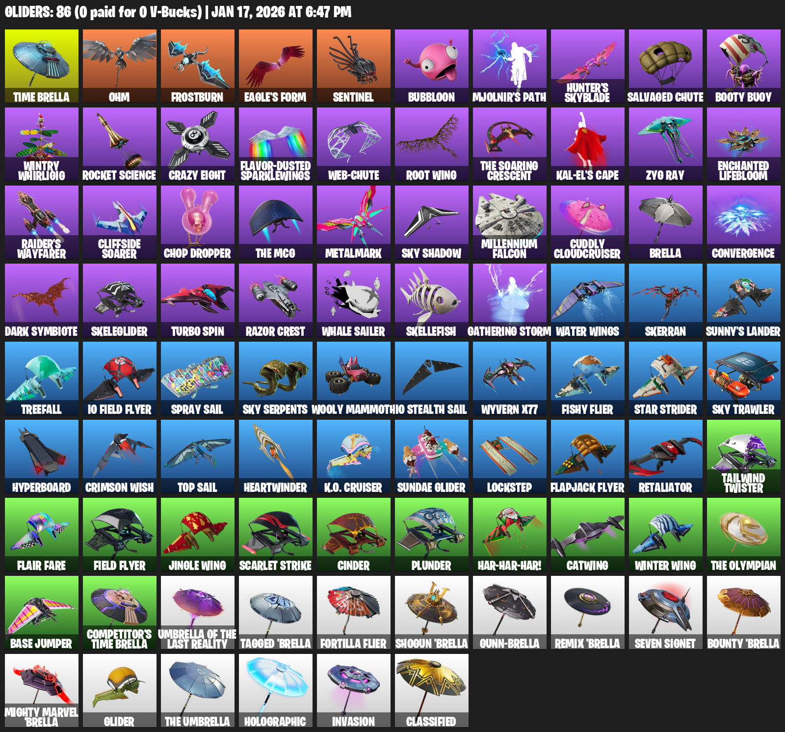 Time Brella, Ohm, Frostburn, Eagle’s Form, Bubbloon, Mjolnir’s Path, Hunter’s Skyblade, Salvaged Chute, Booty Buoy, Wintry Whirligig, Rocket Science, Crazy Eight, Flavor-Dusted Sparklewings, Root Wing, Kal-El’s Cape, Zyg Ray, Enchanted Lifebloom