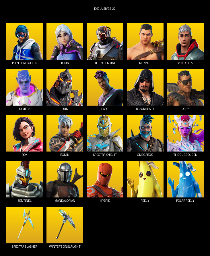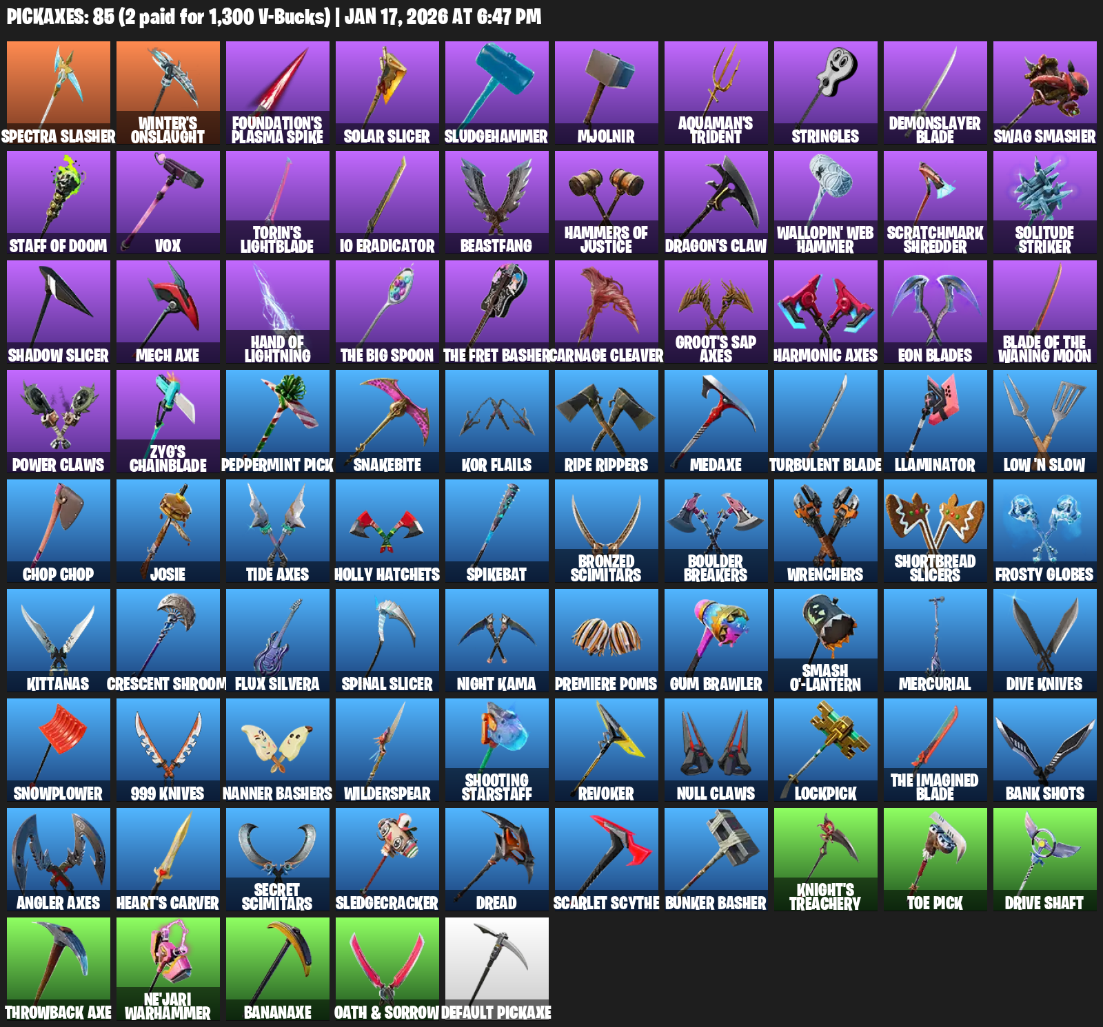 Winter’s Onslaught, Foundation’s Plasma Spike, Solar Slicer, Sludgehammer, Mjolnir, Aquaman’s Trident, Stringles, Demonslayer Blade, Swag Smasher, Staff of Doom, Vox, Torin’s Lightblade, IO Eradicator, Beastfang, Dragon’s Claw, Wallopin’ Web Hammer, Scratchmark Shredder, Solitude Striker