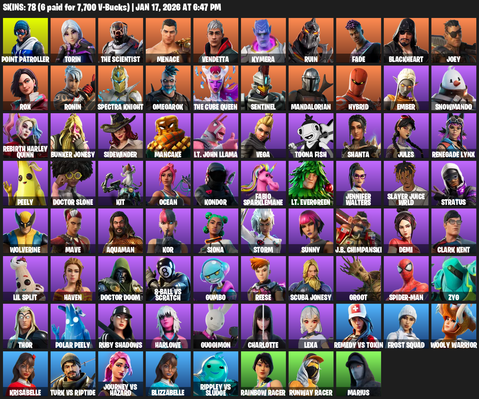 Point Patroller, Torin, The Scientist, Menace, Vendetta, Kymera, Ruin, Fade, Blackheart, Joey, Rox, Ronin, Spectra Knight, Omegarok, Sentinel, Mandalorian, Hybrid, Ember, Snowmando